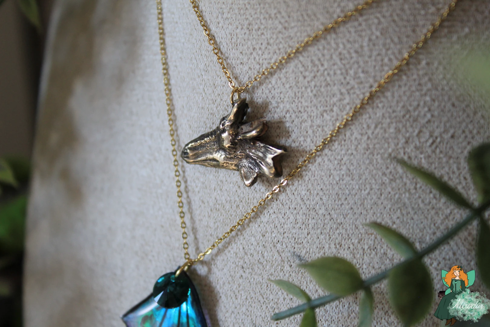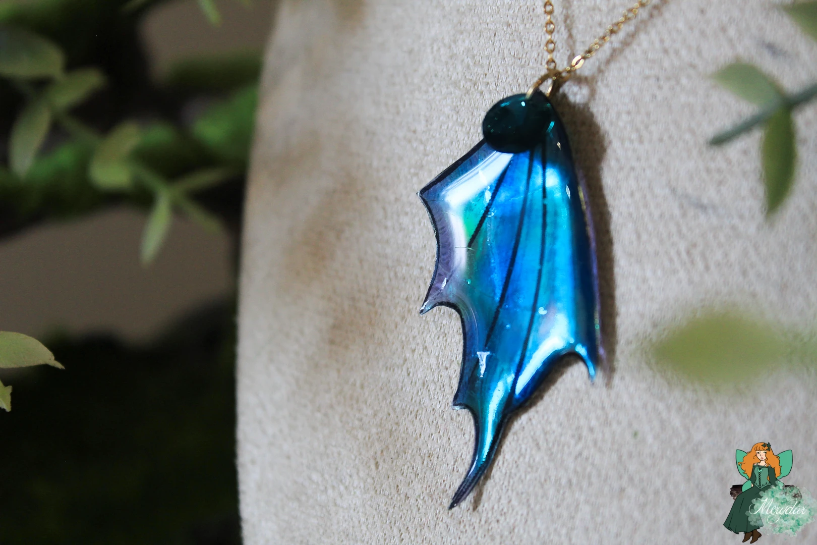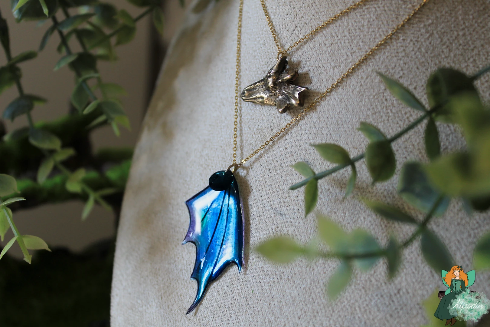 Collier double rang composé d’une Aile de Fée, au dégradé de couleurs enchanteur, ornées de strass en Cristal de Fée*, avec des couleurs iridescentes qui scintillent et changent de teintes en fonction de la lumière, créant un effet magique et captivant. Un Cristal de Fée* y est suspendu. Une tête de dragon en bronze façonné à la main à l’atelier surplombe l’Aile.