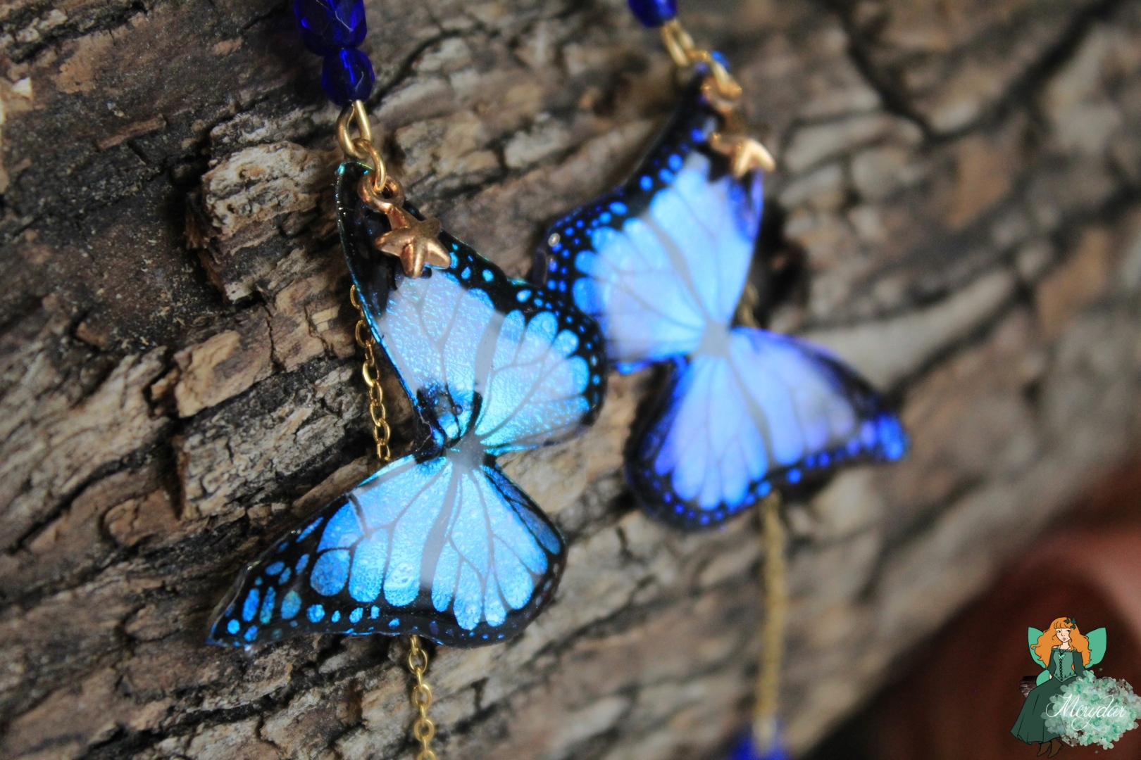 Petites douceurs Ailées. Composées de deux adorables papillons irisés, brillant de mille feux. De  Cristaux de Fée y sont suspendus. La chaine est en acier inoxydable.