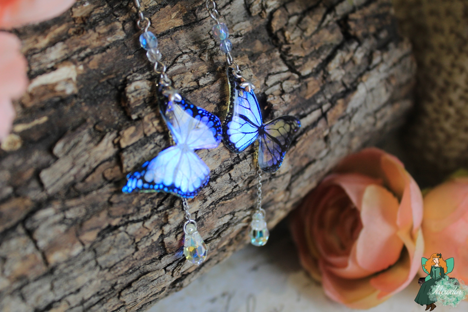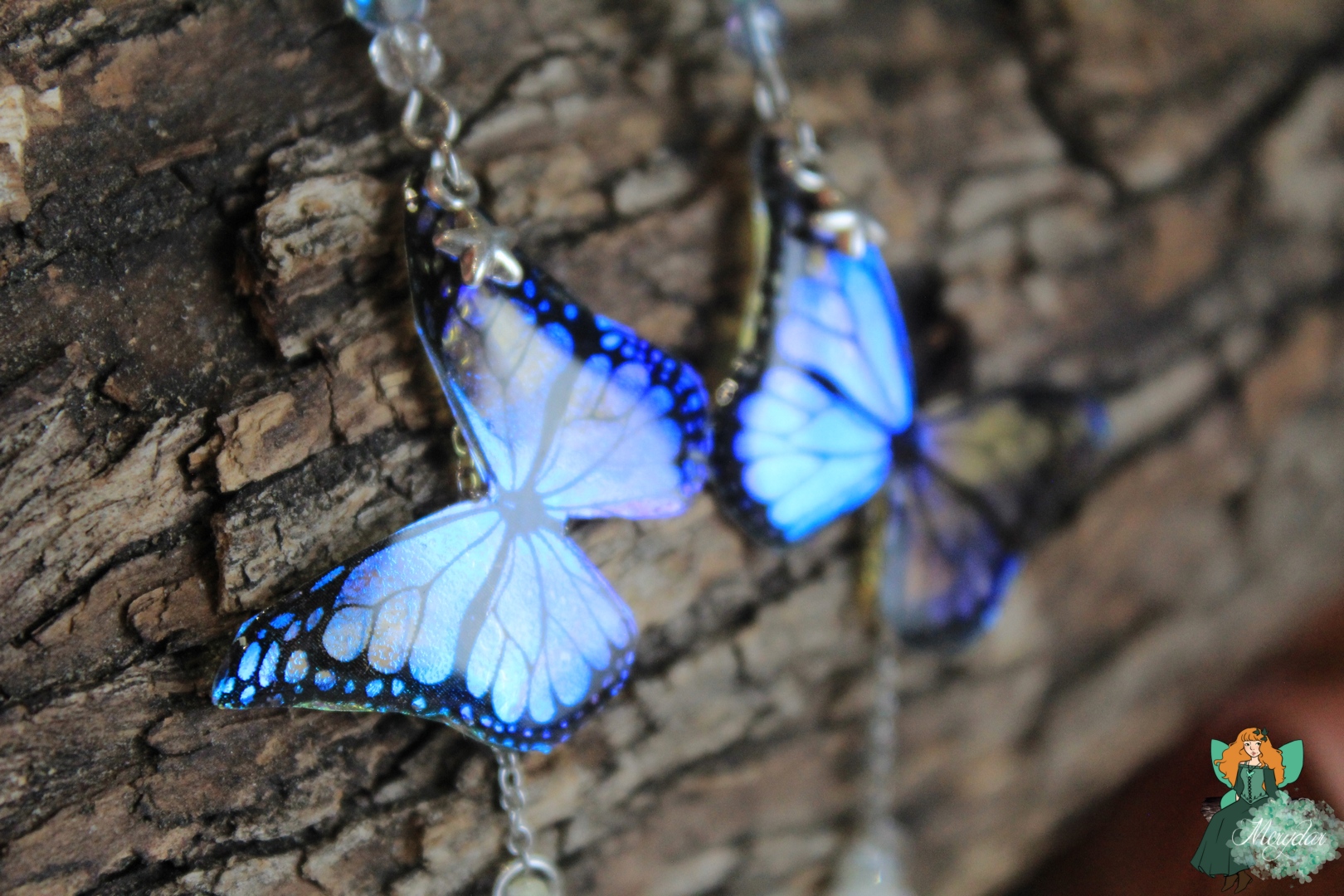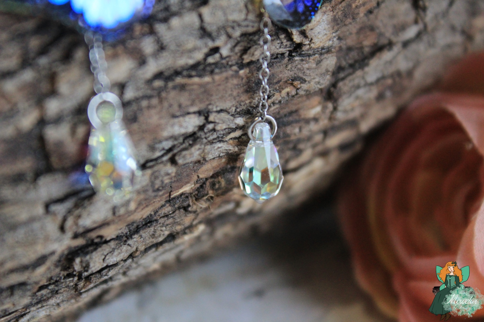 Petites douceurs Ailées. Composées de deux adorables papillons irisés, brillant de mille feux. De Cristaux de Fée y sont suspendus. La chaine est en acier inoxydable.
