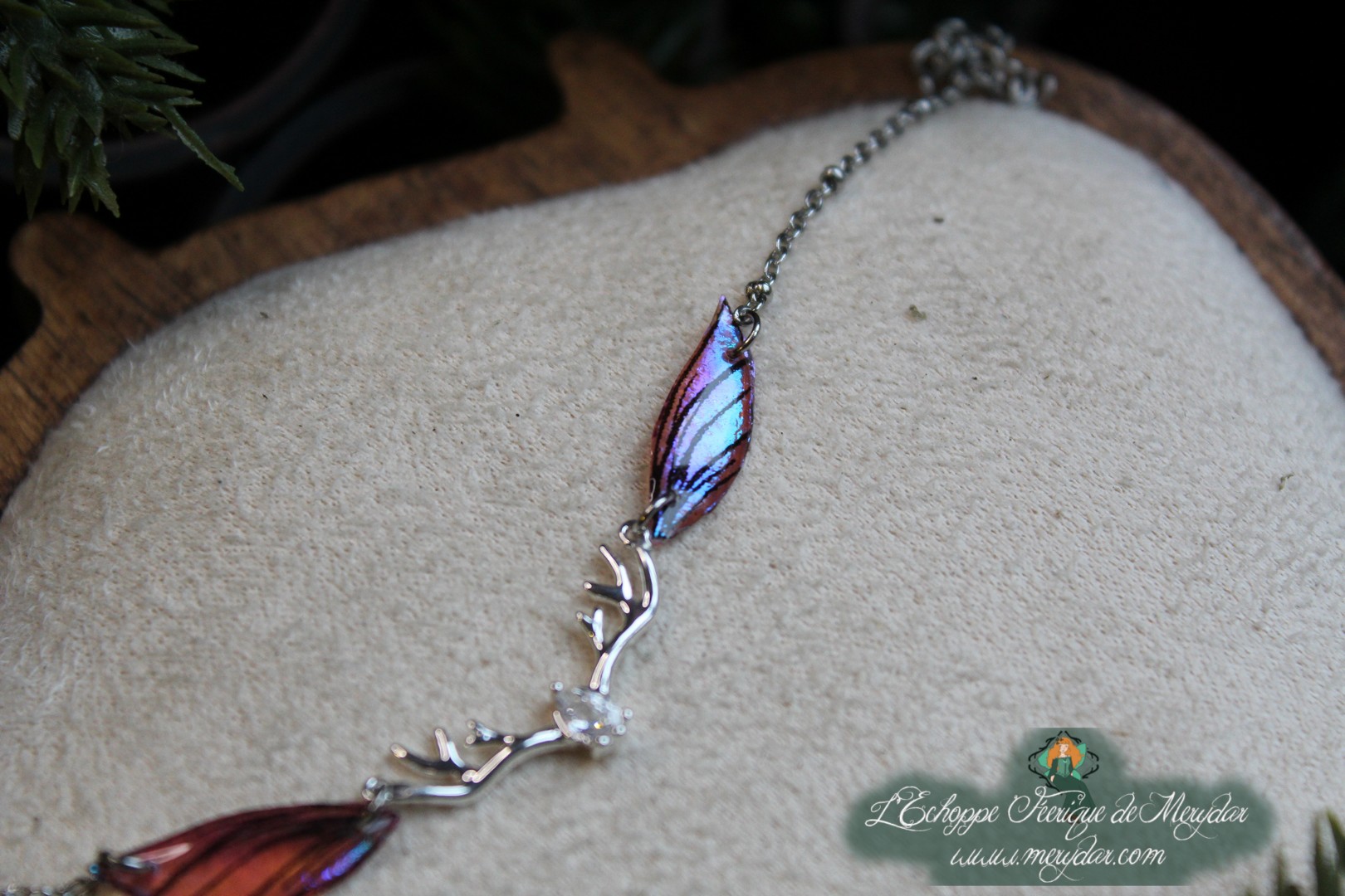 Bracelet composé de deux Ailes de Fée, au dégradé de couleurs enchanteur. Elles sont reliées une ramure de bois de renne, en laiton plaqué or orné d’un zircon. Le bracelet est articulé grâce au jeu des anneaux. Il mesure environ 14 cm + 5 cm d’extension.