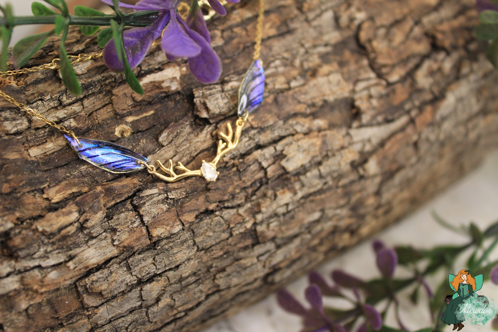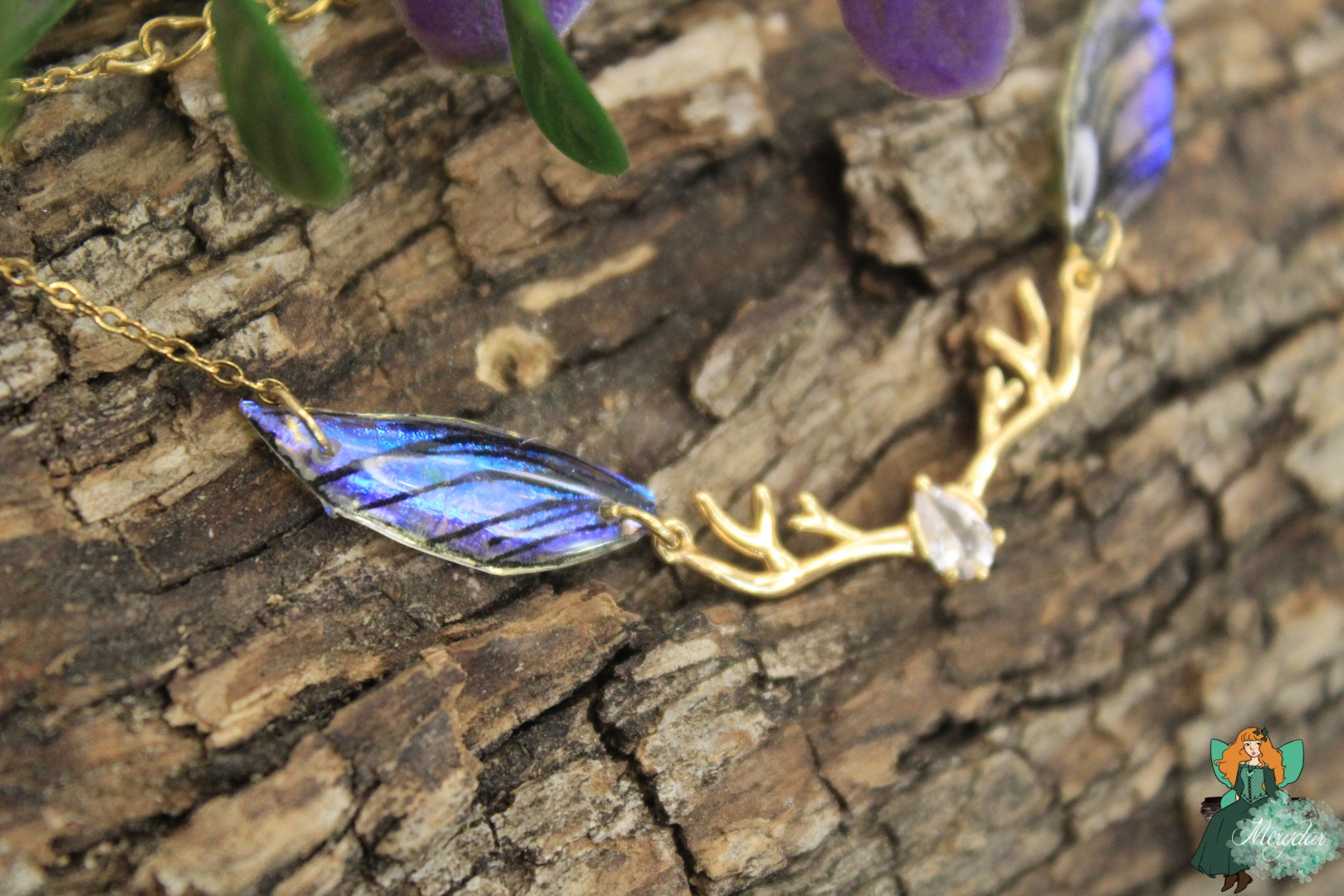 Ce bracelet se compose de deux petites Ailes de Fée irisées, aux couleurs chatoyantes. Une breloque en acier inoxydable et en forme de bois de cerf l’accompagne. La chaine est en acier inoxydable.