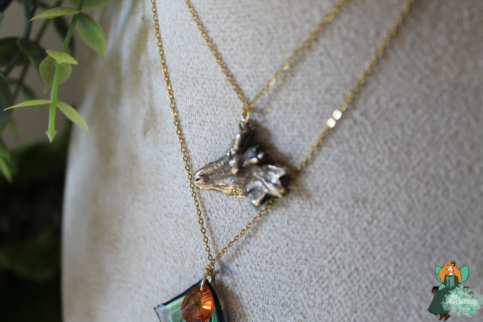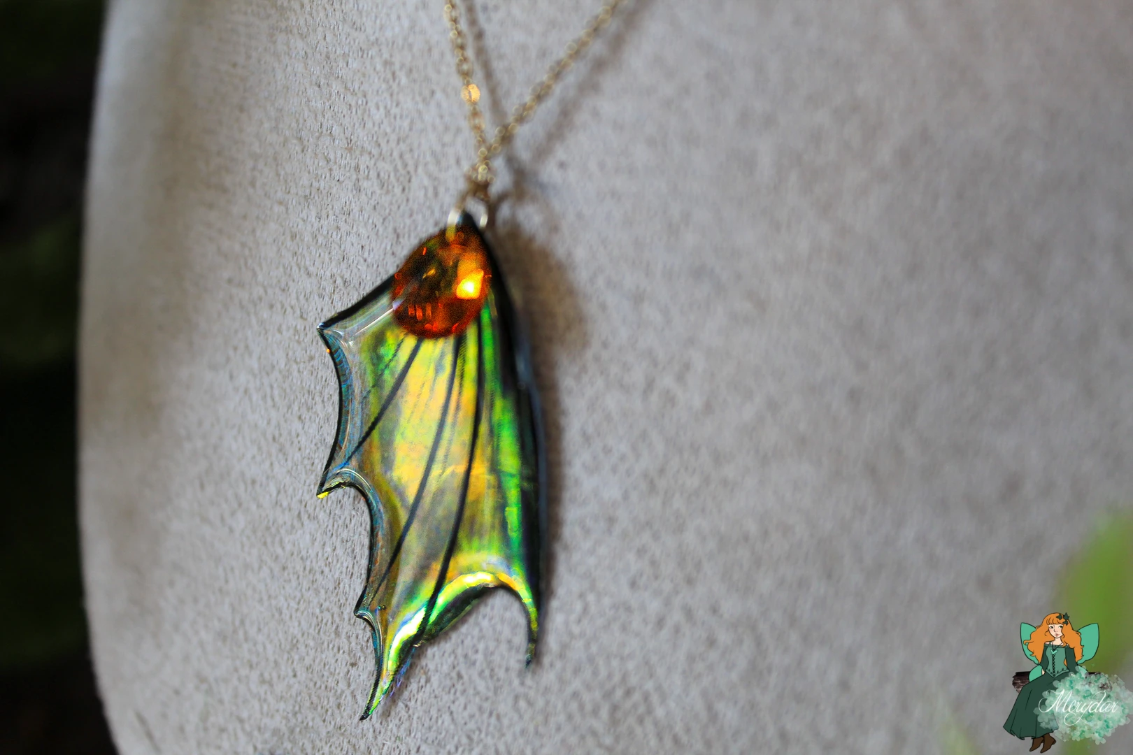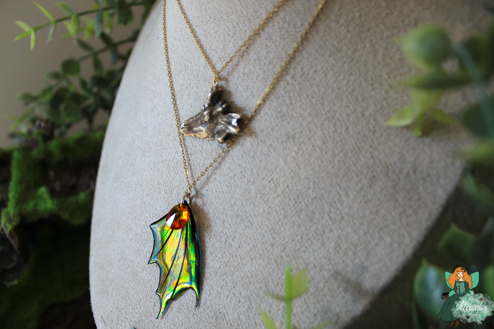 Collier double rang composé d’une Aile de Fée, au dégradé de couleurs enchanteur, ornées de strass en Cristal de Fée*, avec des couleurs iridescentes qui scintillent et changent de teintes en fonction de la lumière, créant un effet magique et captivant. Un Cristal de Fée* y est suspendu. Une tête de dragon en bronze façonné à la main à l’atelier surplombe l’Aile.