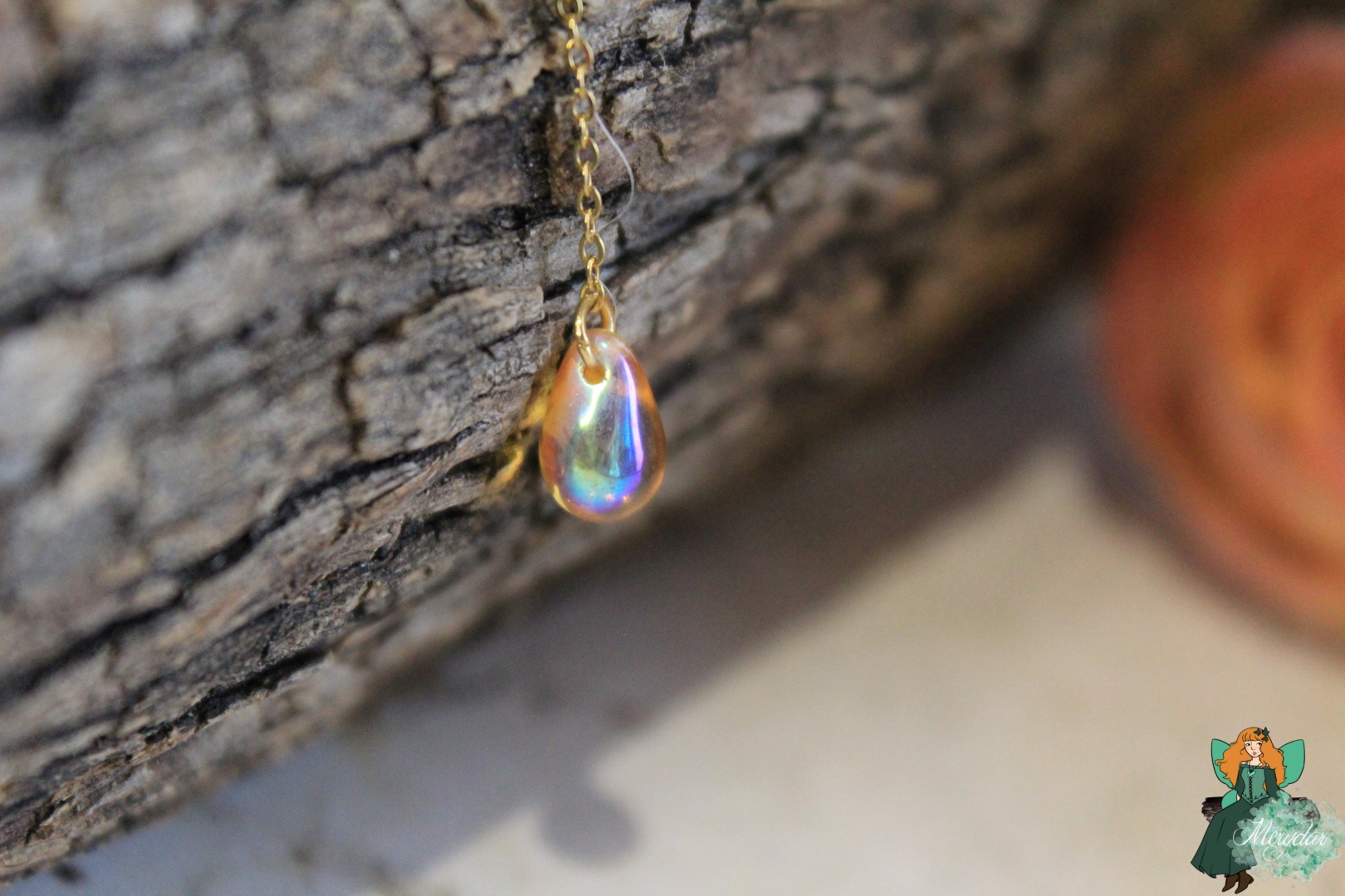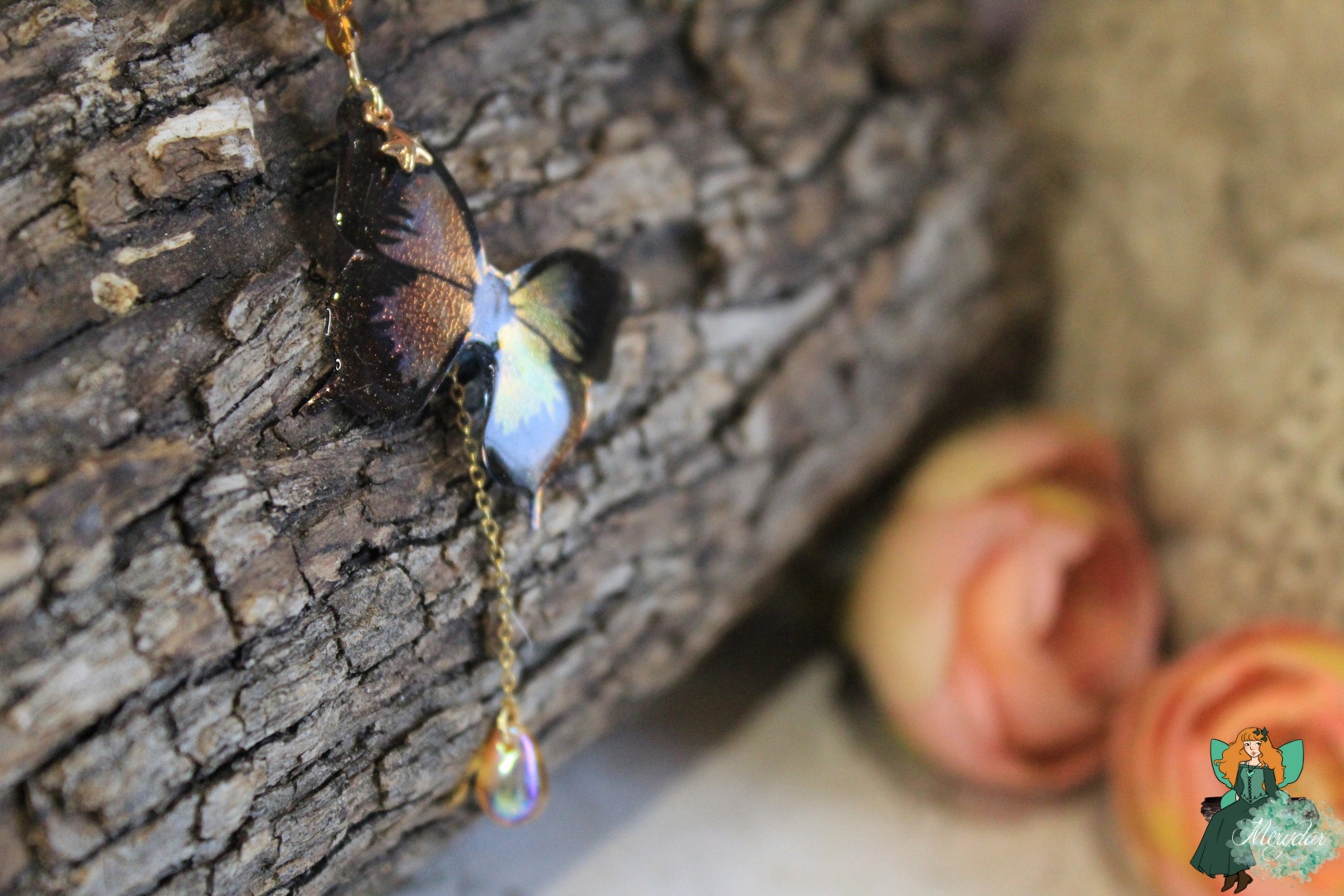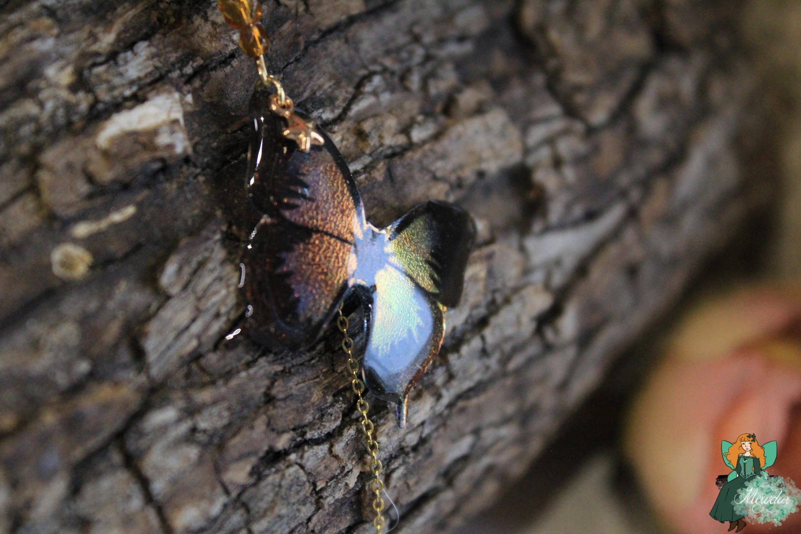 Ce pendentif se compose d’un papillon irisé, aux couleurs chatoyantes. Des perles et un pendentif en Cristal de Fée*  l’accompagnent, ainsi qu’une petite étoile. La chaine est en acier inoxydable.