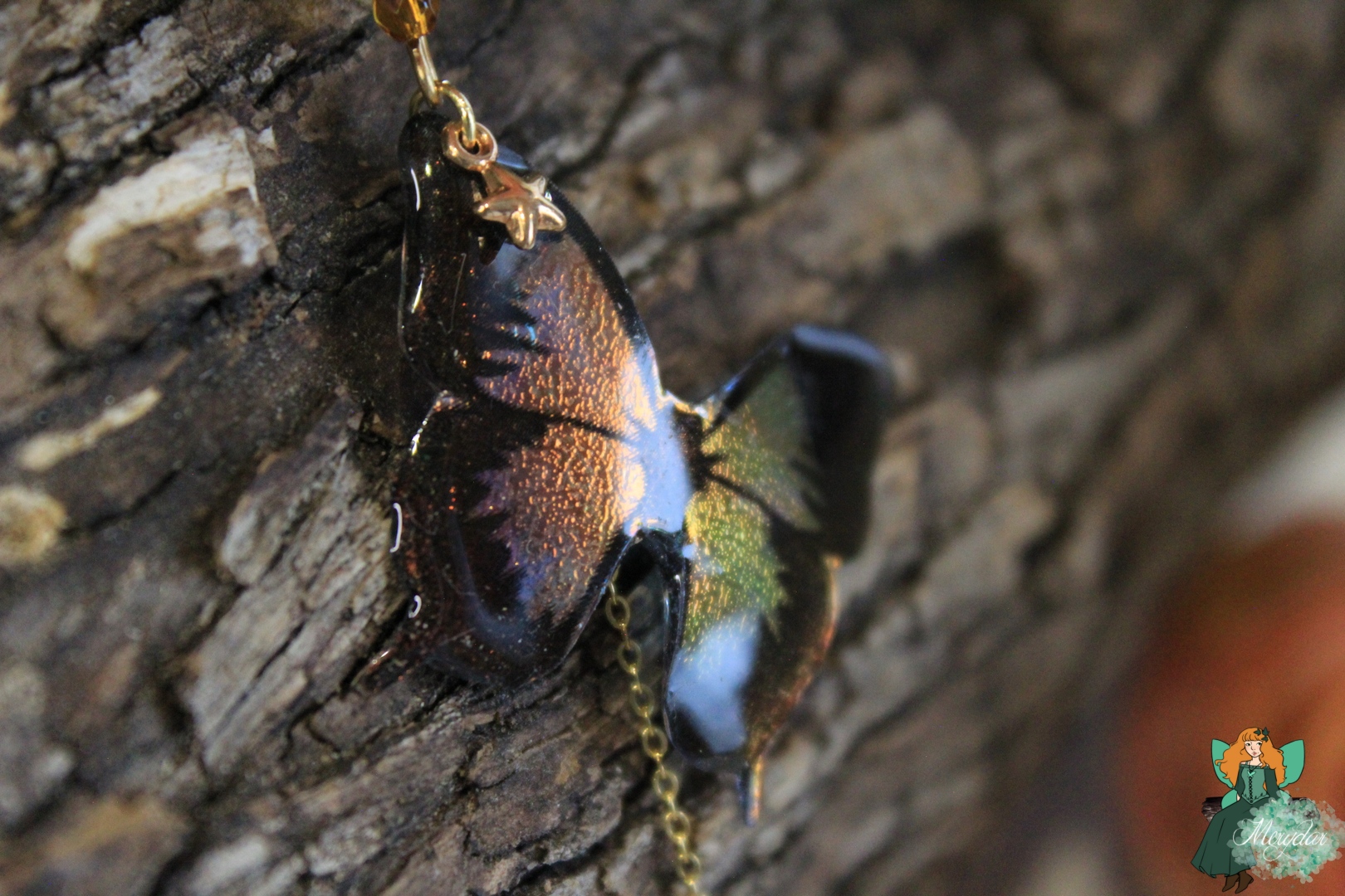 La Poussière de Fée crée d’incroyables reflets holographiques. Selon l’orientation des Ailes, les rayons de lumière solaire accrochent différemment et les couleurs changent et deviennent chatoyantes.  Leur procédé de confection reste secret, sinon, il perdrait toute sa magie !