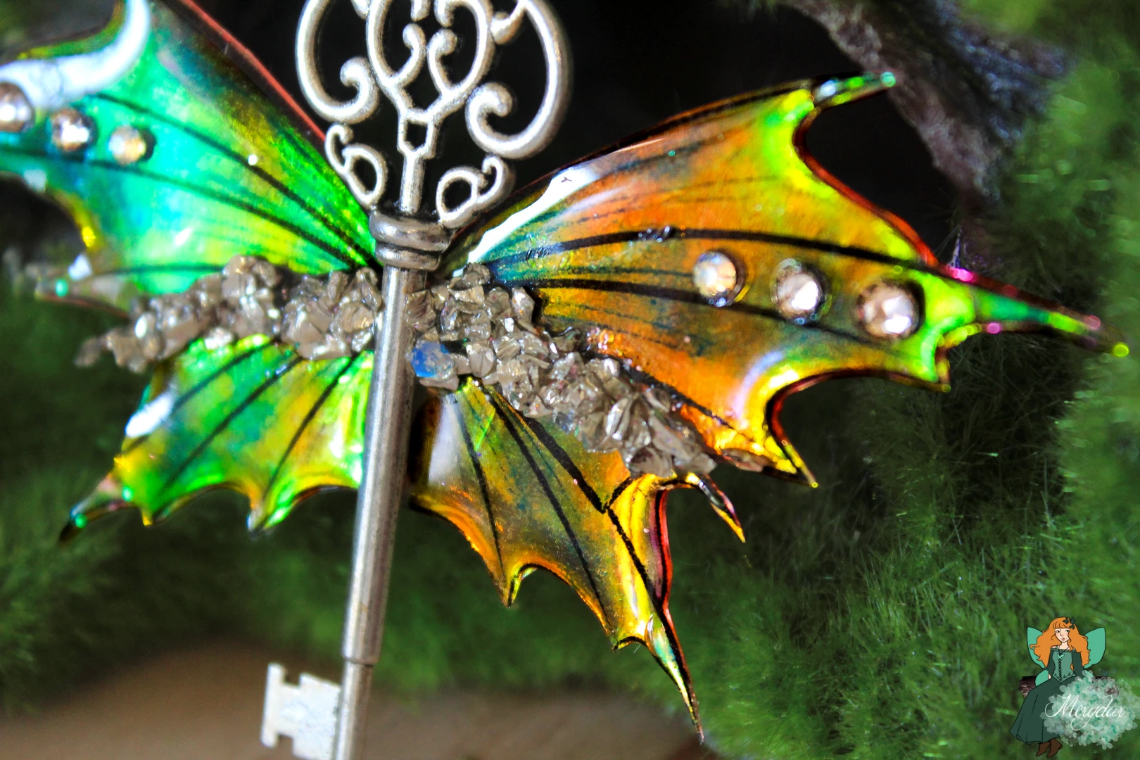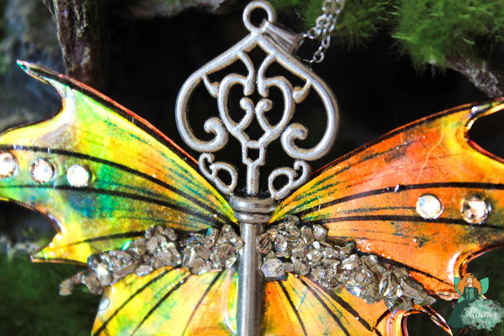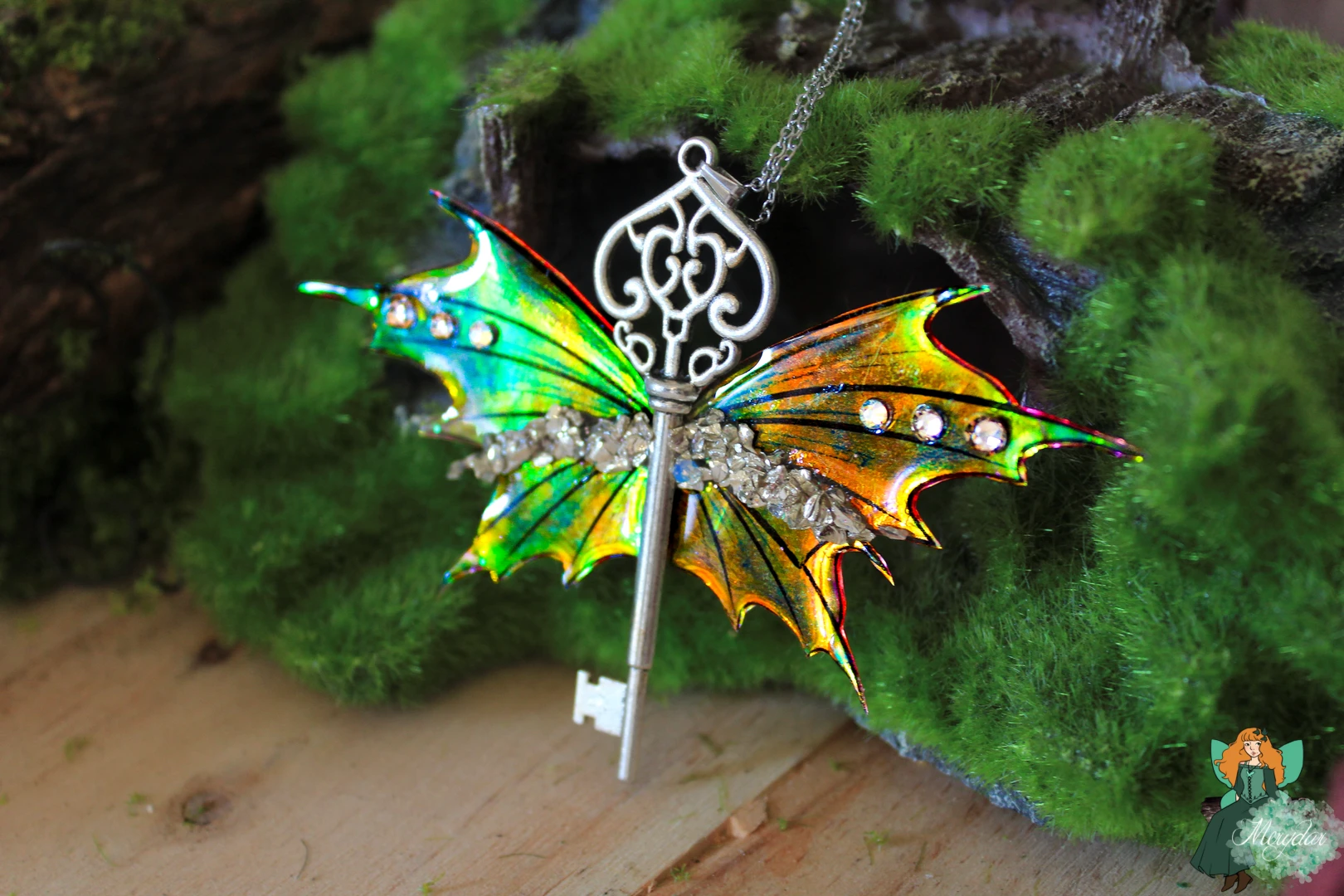 Collier composé de quatre Ailes de Fée, au dégradé de couleurs enchanteur, ornées de strass en Cristal de Fée*, avec des couleurs iridescentes qui scintillent et changent de teintes en fonction de la lumière, créant un effet magique et captivant.. Une clé en laiton argenté illumine le coeur de ce bijou.
