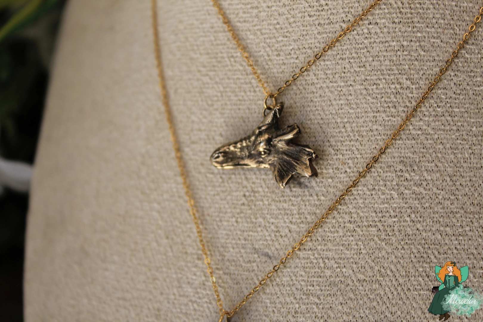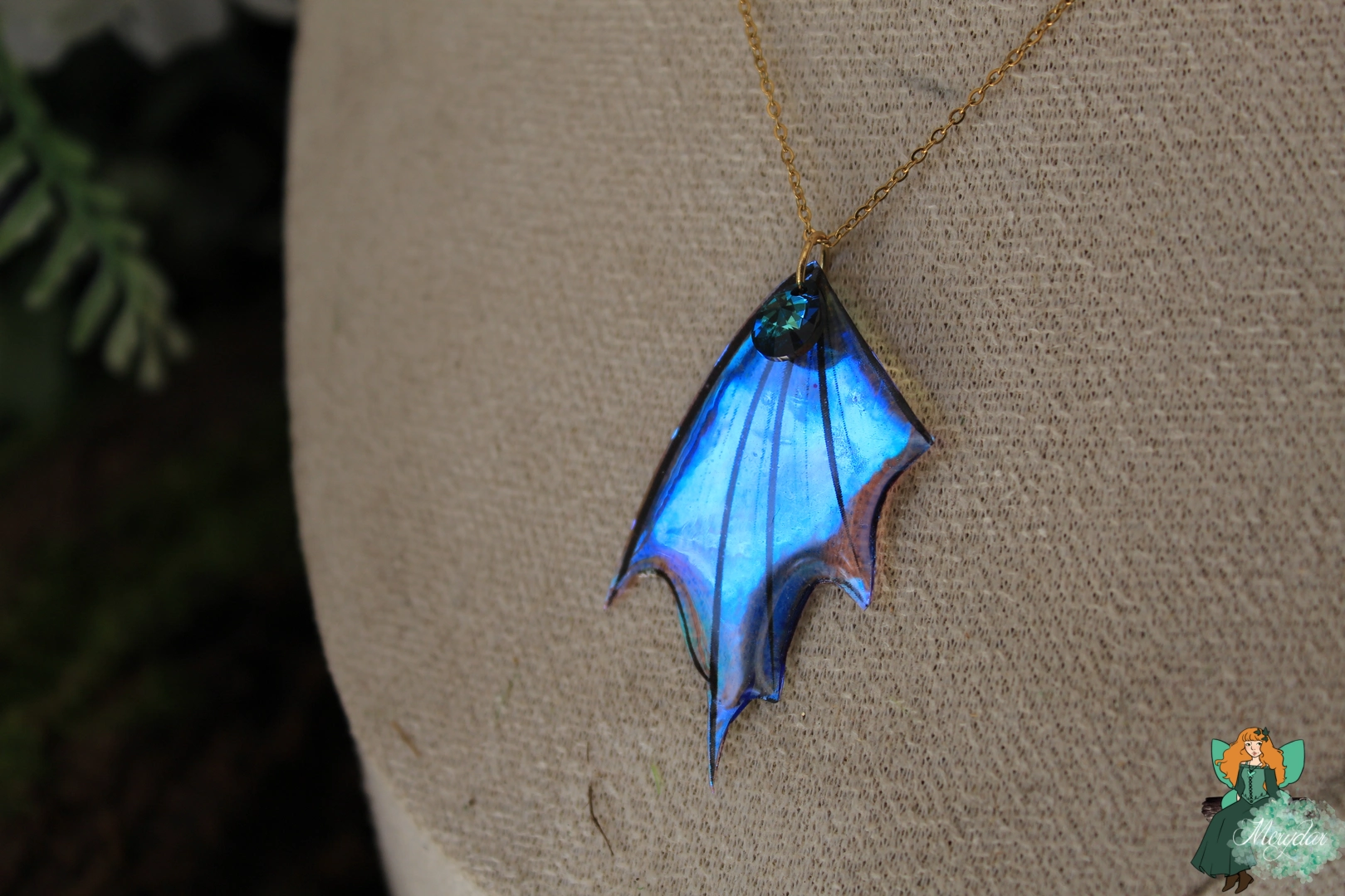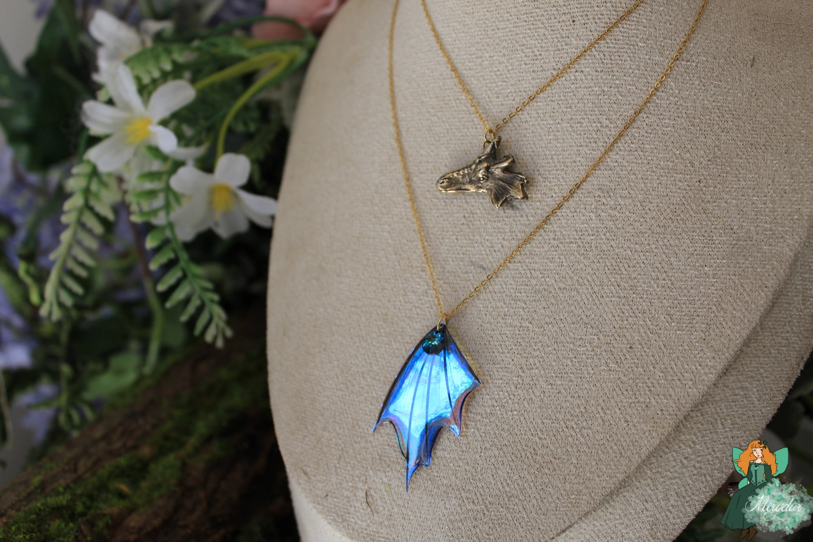 Collier double rang composé d’une Aile de Fée, au dégradé de couleurs enchanteur, ornées de strass en Cristal de Fée*, avec des couleurs iridescentes qui scintillent et changent de teintes en fonction de la lumière, créant un effet magique et captivant. Un Cristal de Fée* y est suspendu. Une tête de dragon en bronze façonné à la main à l’atelier surplombe l’Aile.