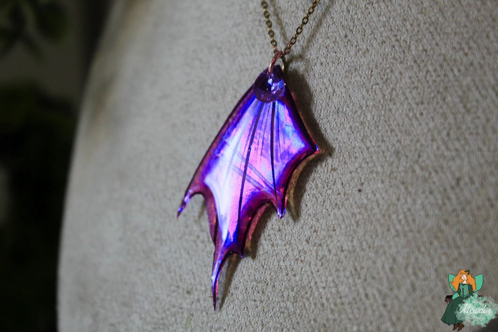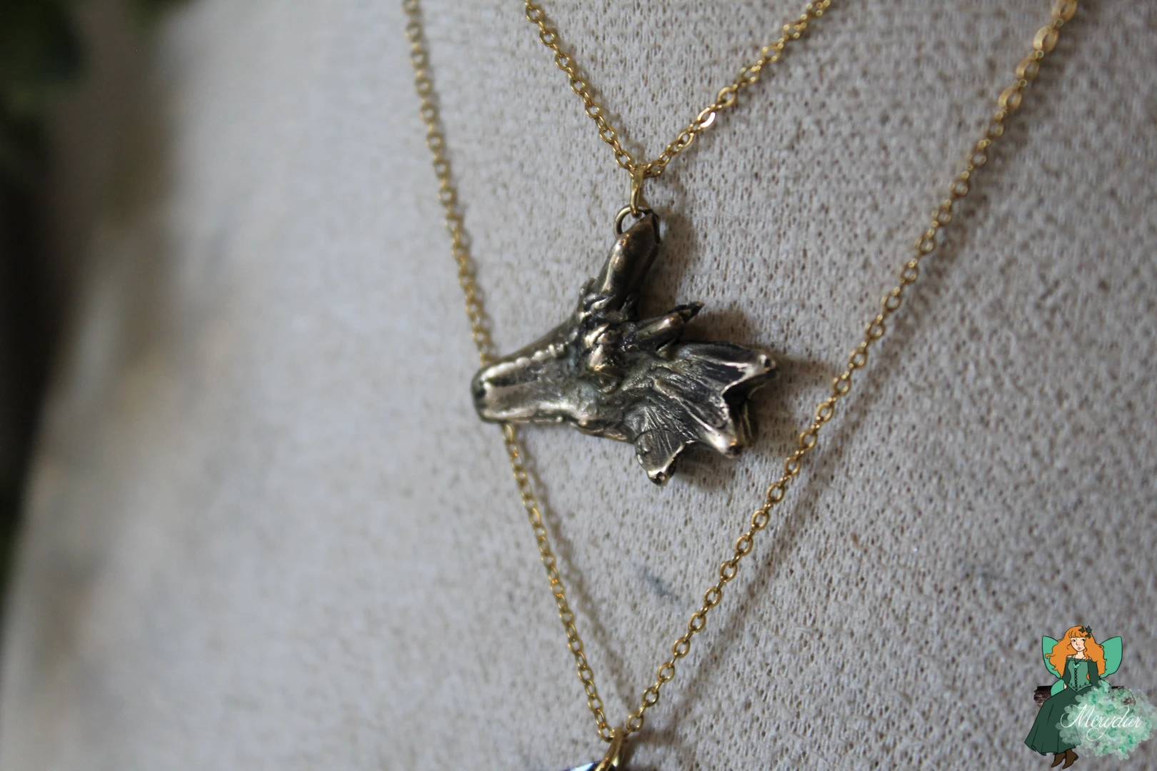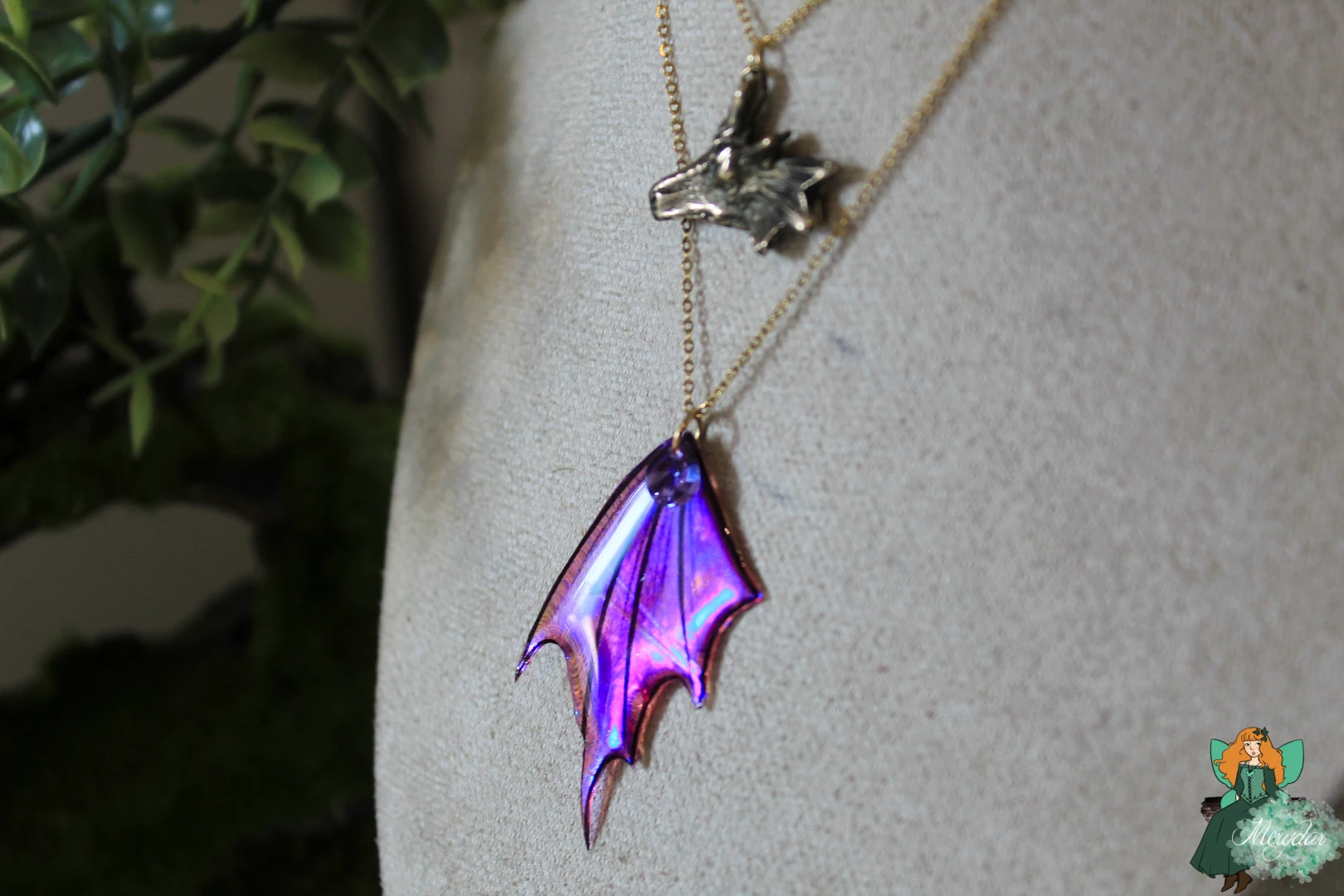 Collier double rang composé d’une Aile de Fée, au dégradé de couleurs enchanteur, ornées de strass en Cristal de Fée*, avec des couleurs iridescentes qui scintillent et changent de teintes en fonction de la lumière, créant un effet magique et captivant. Un Cristal de Fée* y est suspendu. Une tête de dragon en bronze façonné à la main à l’atelier surplombe l’Aile.