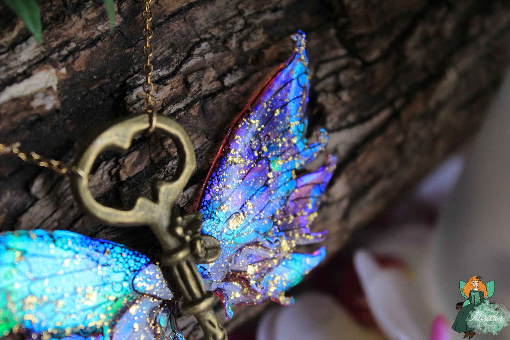 La Poussière de Fée crée d’incroyables reflets holographiques. Selon l’orientation des Ailes, les rayons de lumière solaire accrochent différemment et les couleurs changent et deviennent chatoyantes.  Leur procédé de confection reste secret, sinon, il perdrait toute sa magie !