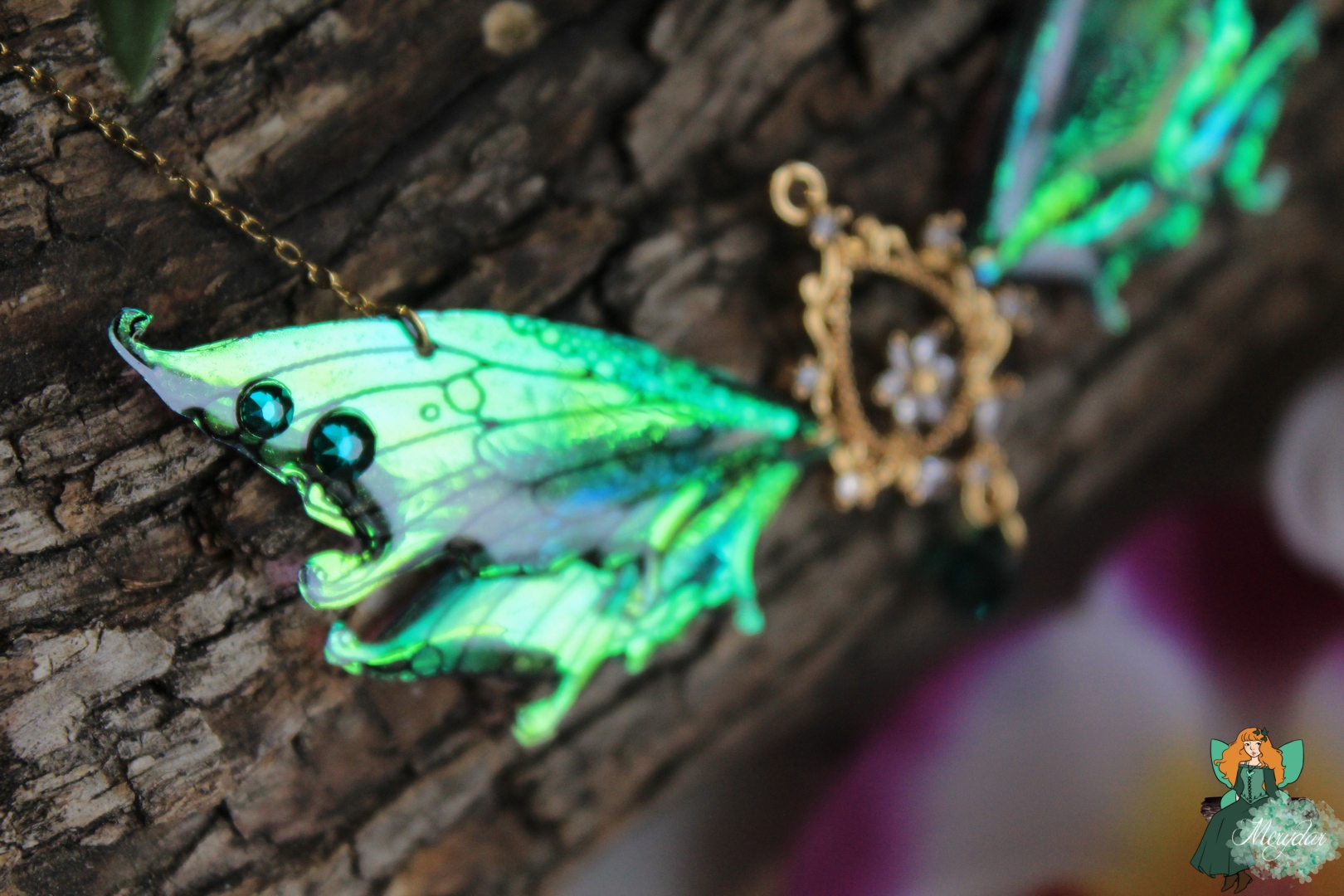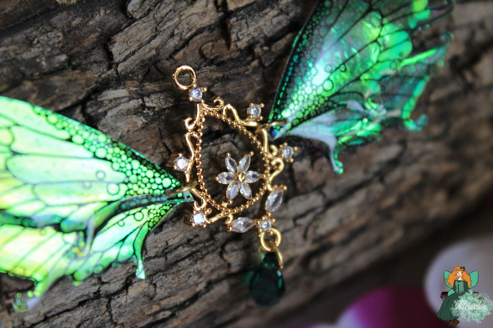 La Poussière de Fée crée d’incroyables reflets holographiques. Selon l’orientation des Ailes, les rayons de lumière solaire accrochent différemment et les couleurs changent et deviennent chatoyantes.  Leur procédé de confection reste secret, sinon, il perdrait toute sa magie !
