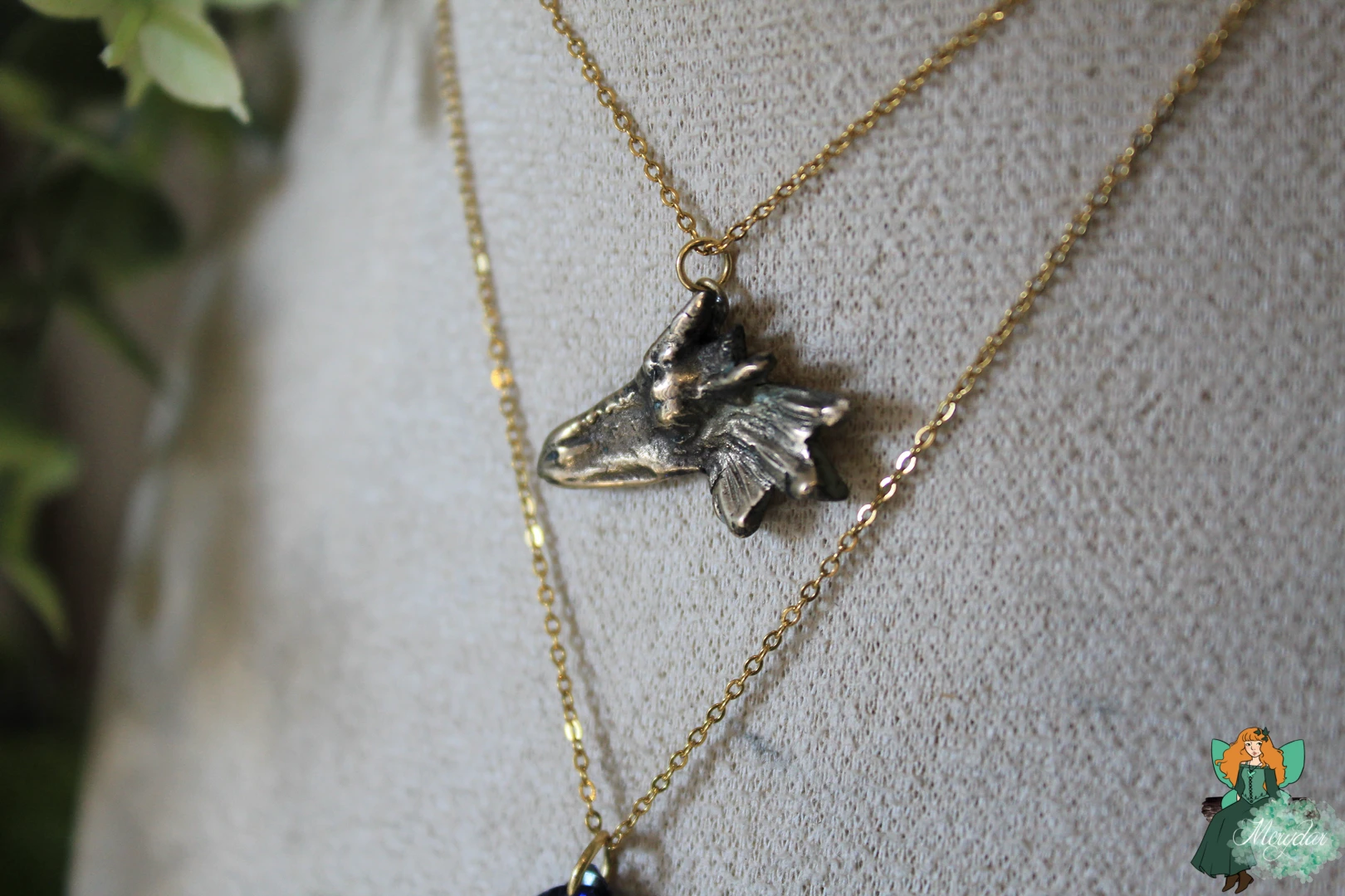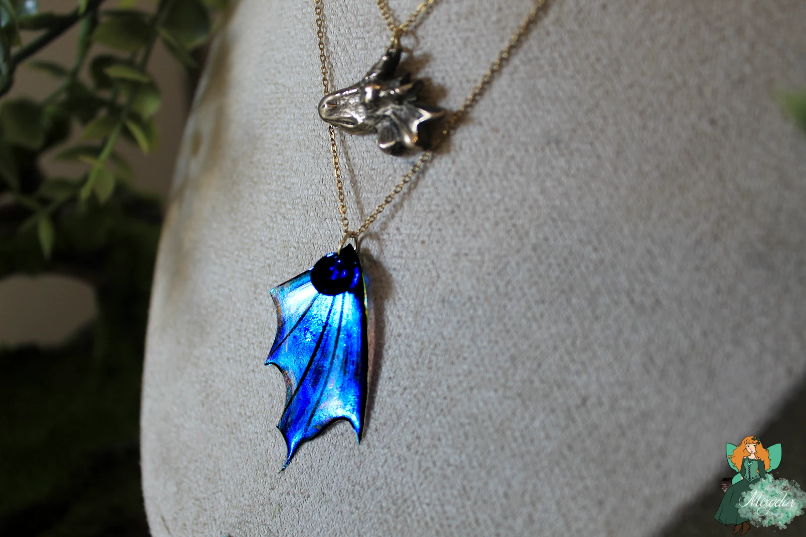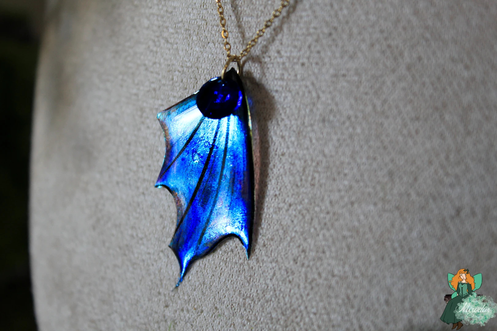 Collier double rang composé d’une Aile de Fée, au dégradé de couleurs enchanteur, ornées de strass en Cristal de Fée*, avec des couleurs iridescentes qui scintillent et changent de teintes en fonction de la lumière, créant un effet magique et captivant. Un Cristal de Fée* y est suspendu. Une tête de dragon en bronze façonné à la main à l’atelier surplombe l’Aile.