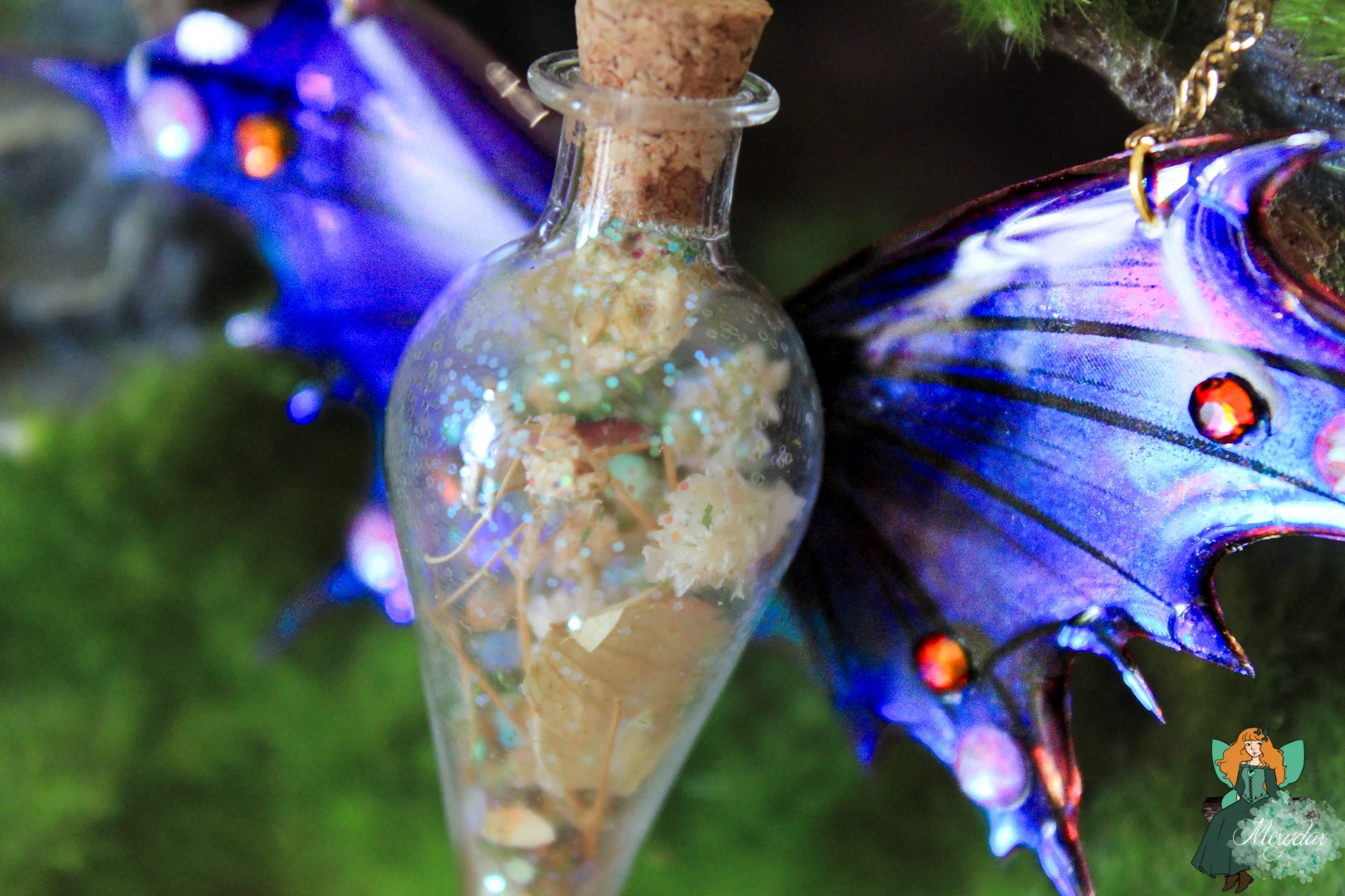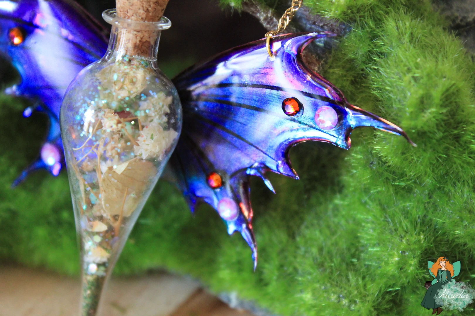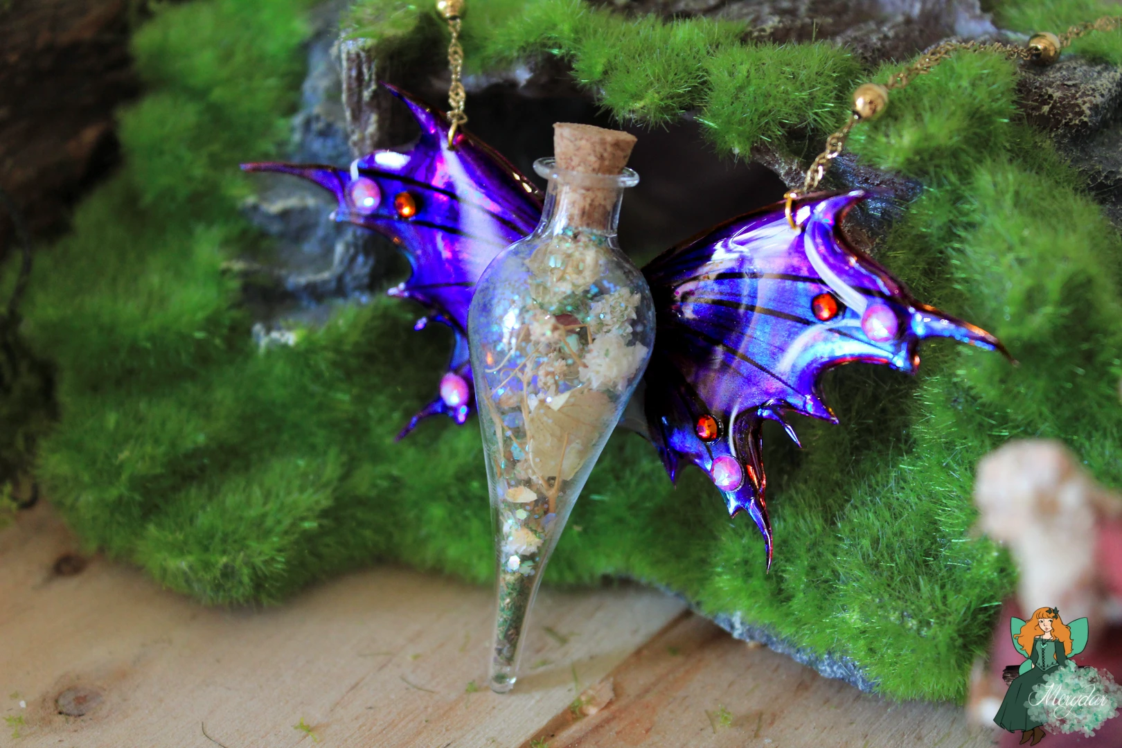 Collier composé de quatre Ailes de Fée, au dégradé de couleurs enchanteur, ornées de strass en Cristal de Fée*avec des couleurs iridescentes qui scintillent et changent de teintes en fonction de la lumière, créant un effet magique et captivant. Une fiole emplit de Poussière de Fée et de plantes séchées illumine le coeur de ce bijou.