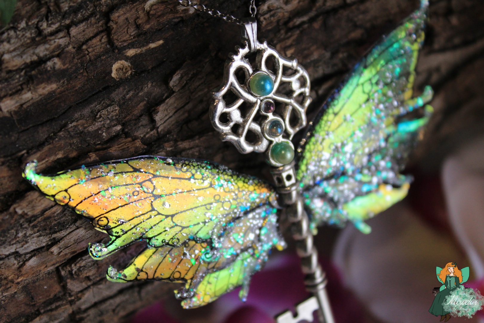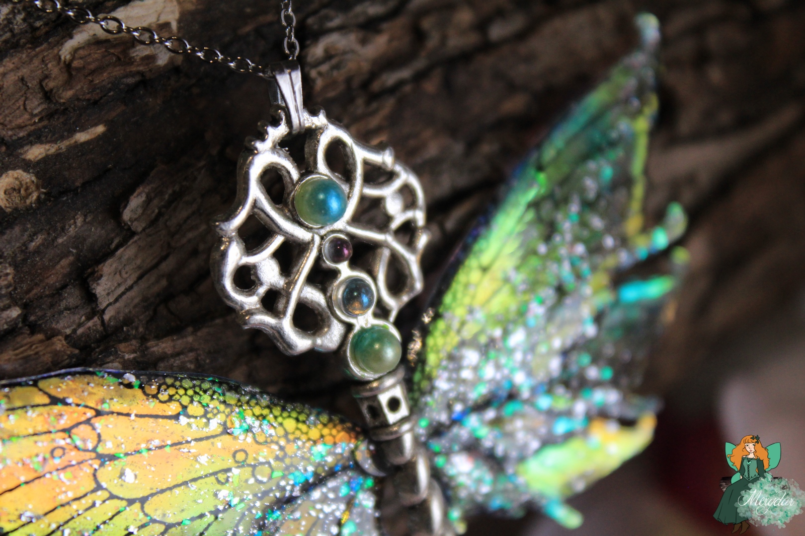 La Poussière de Fée crée d’incroyables reflets holographiques. Selon l’orientation des Ailes, les rayons de lumière solaire accrochent différemment et les couleurs changent et deviennent chatoyantes.  Leur procédé de confection reste secret, sinon, il perdrait toute sa magie !