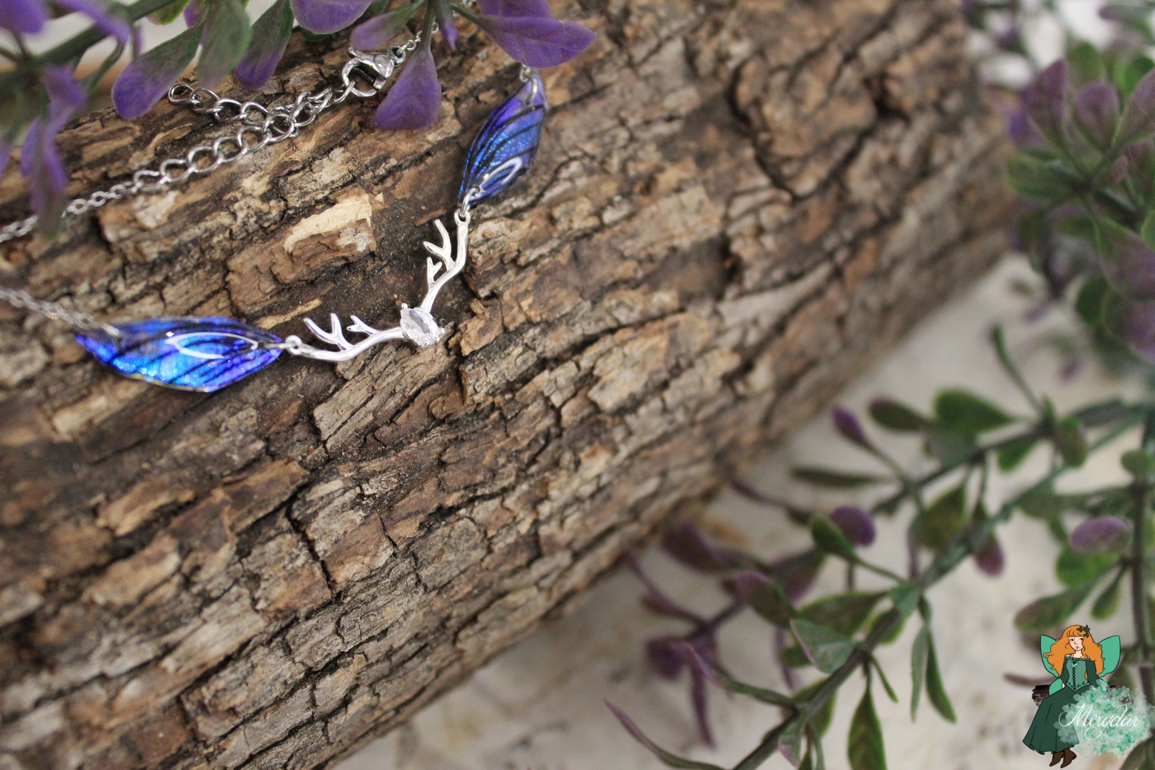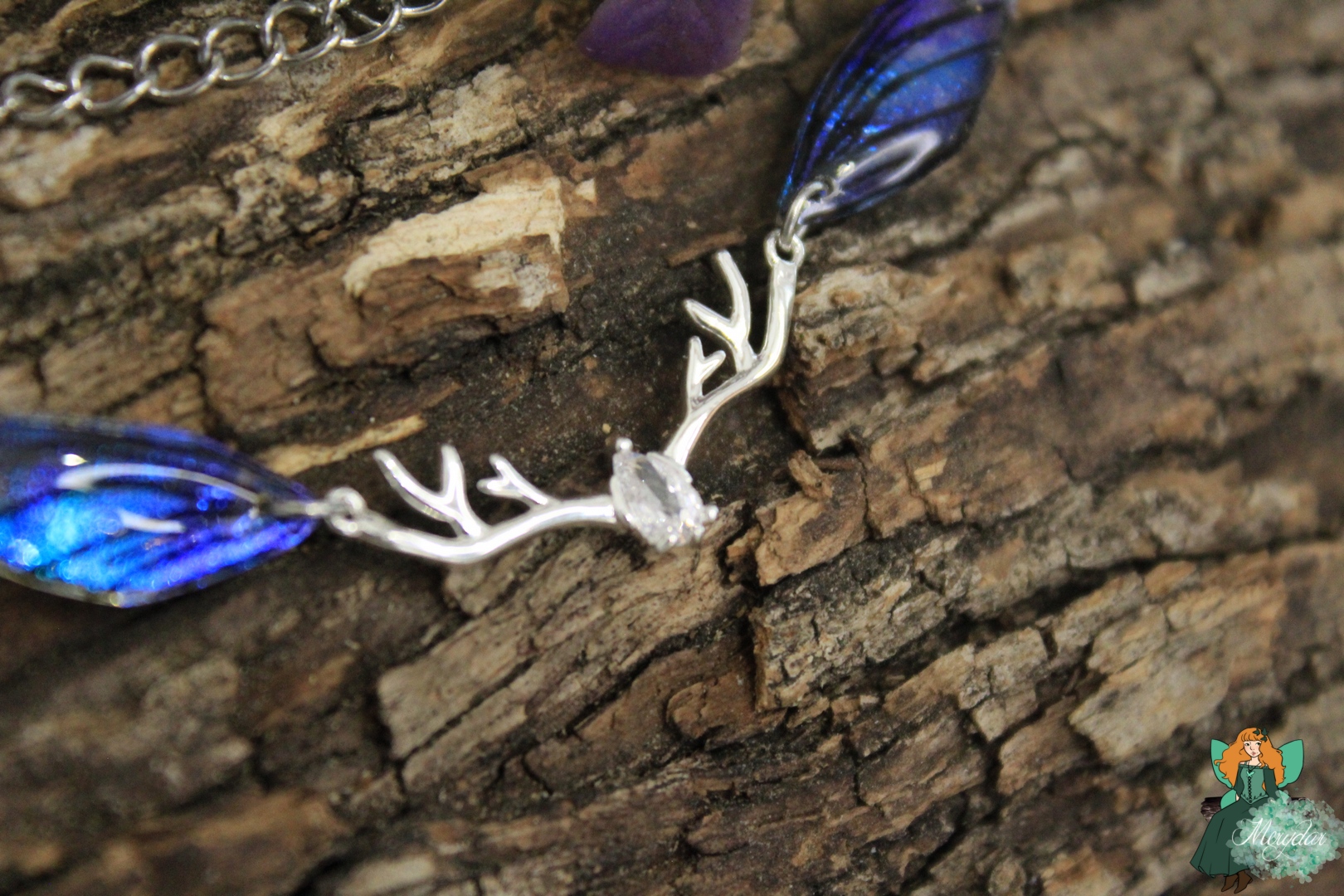 Ce bracelet se compose de deux petites Ailes de Fée irisées, aux couleurs chatoyantes. Une breloque en acier inoxydable et en forme de bois de cerf l’accompagne. La chaine est en acier inoxydable.