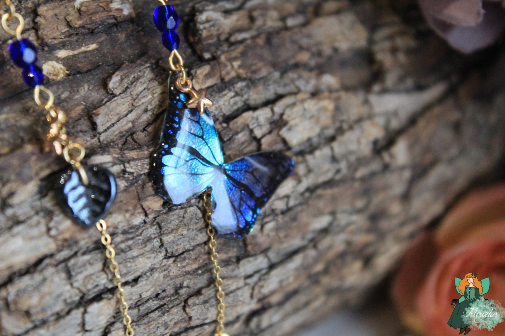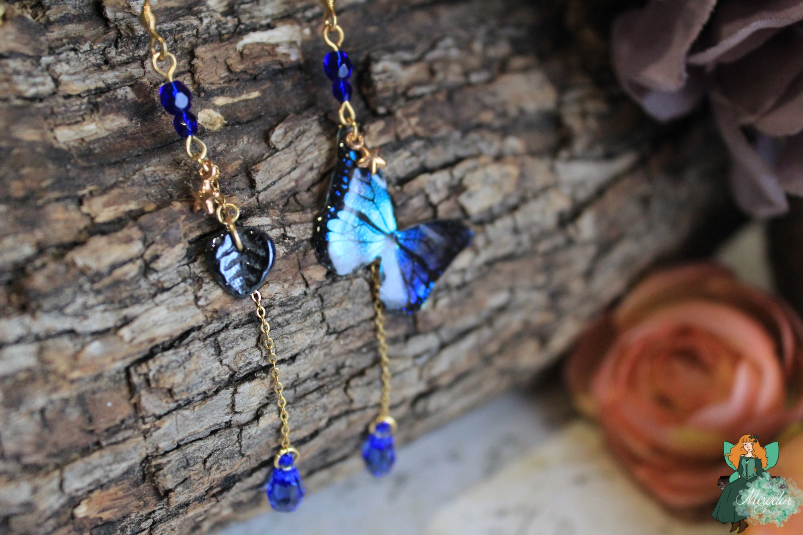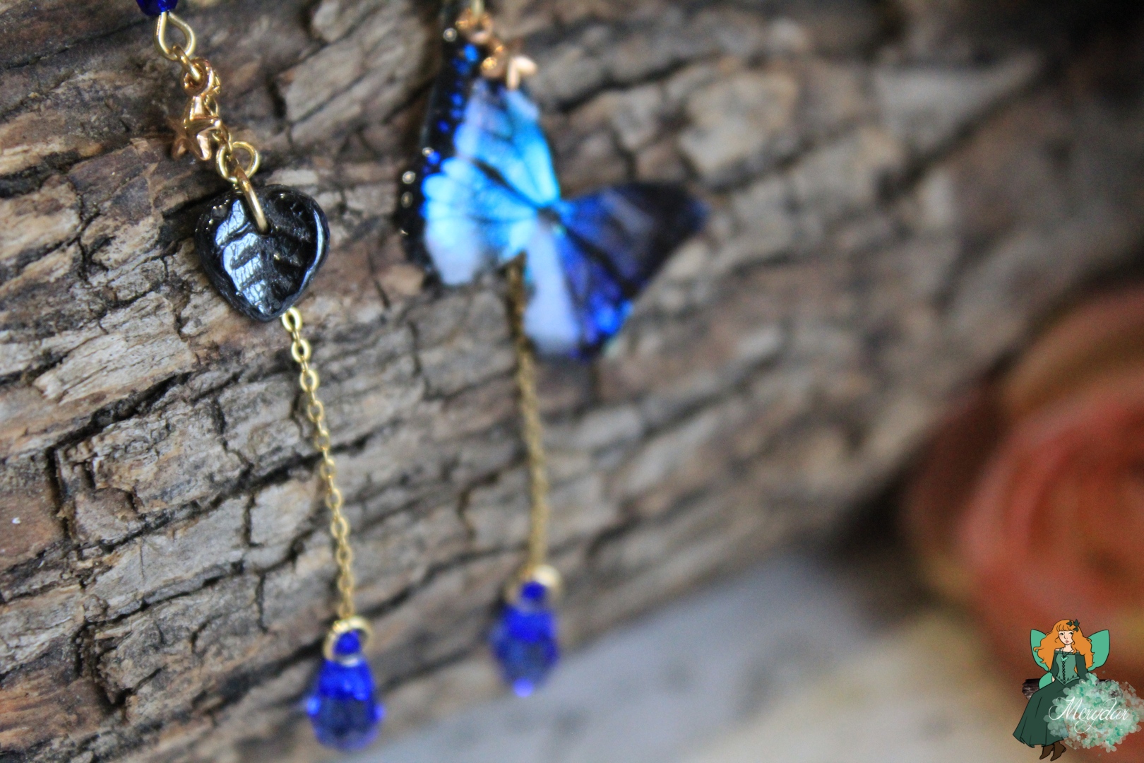 Superbe paire de boucles d’oreille féeriques asymétriques. L’une comporte un superbe papillon irisé, aux reflets holographiques ; l’autre contient une mignonne feuille de verre tchèque. Une myriade de perles, une petite étoile et un pendant en Cristal de Fée*  les accompagnent. La chaine est en acier inoxydable.