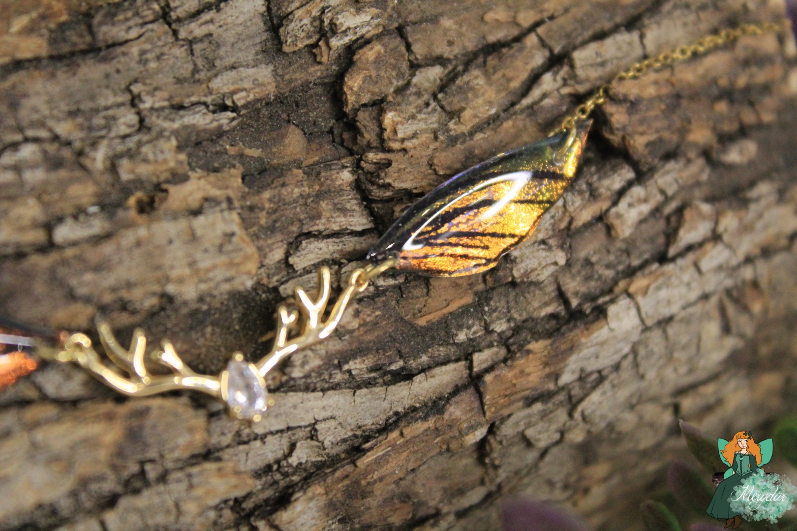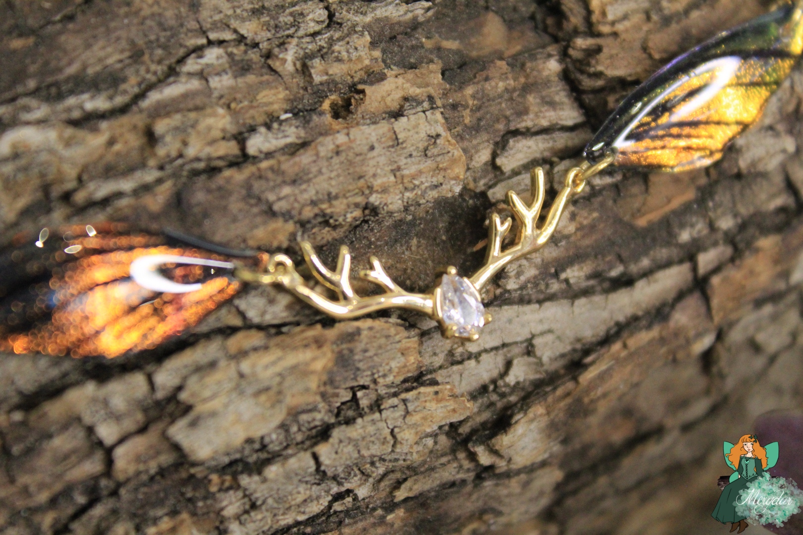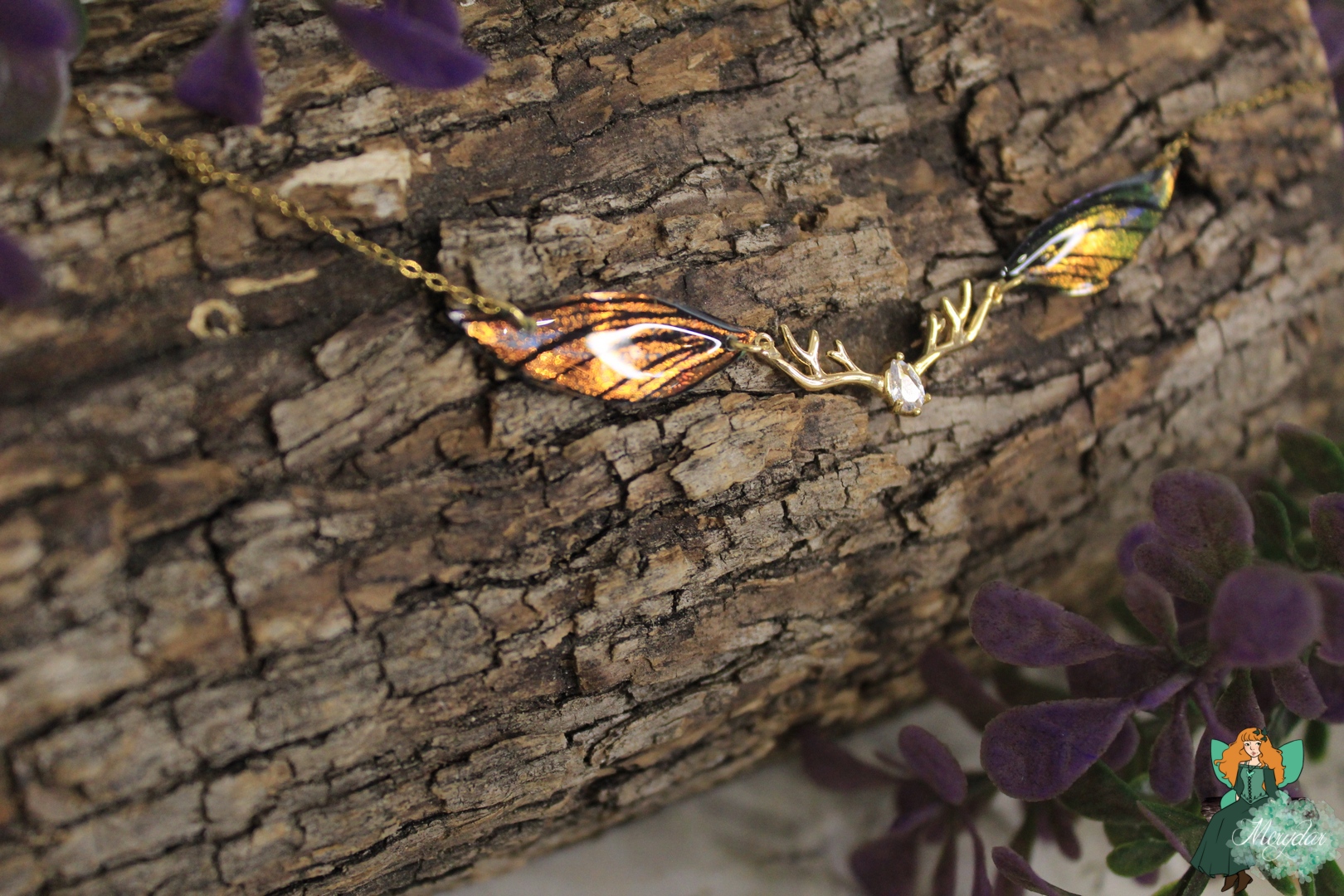 Ce ras-de-cou se compose de deux petites Ailes de Fée irisées, aux couleurs chatoyantes. Une breloque en acier inoxydable et en forme de bois de cerf l’accompagne. La chaine est en acier inoxydable.
