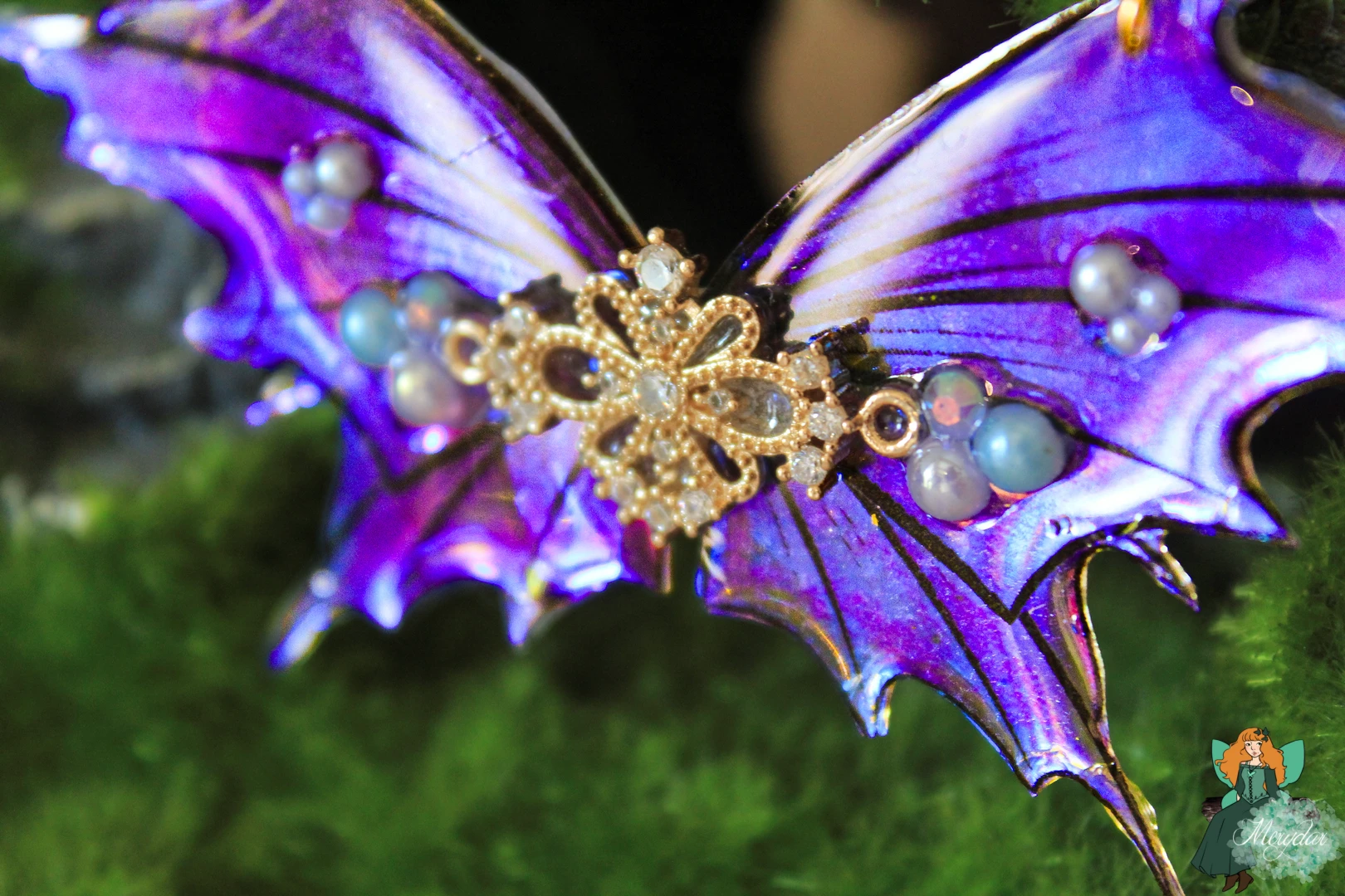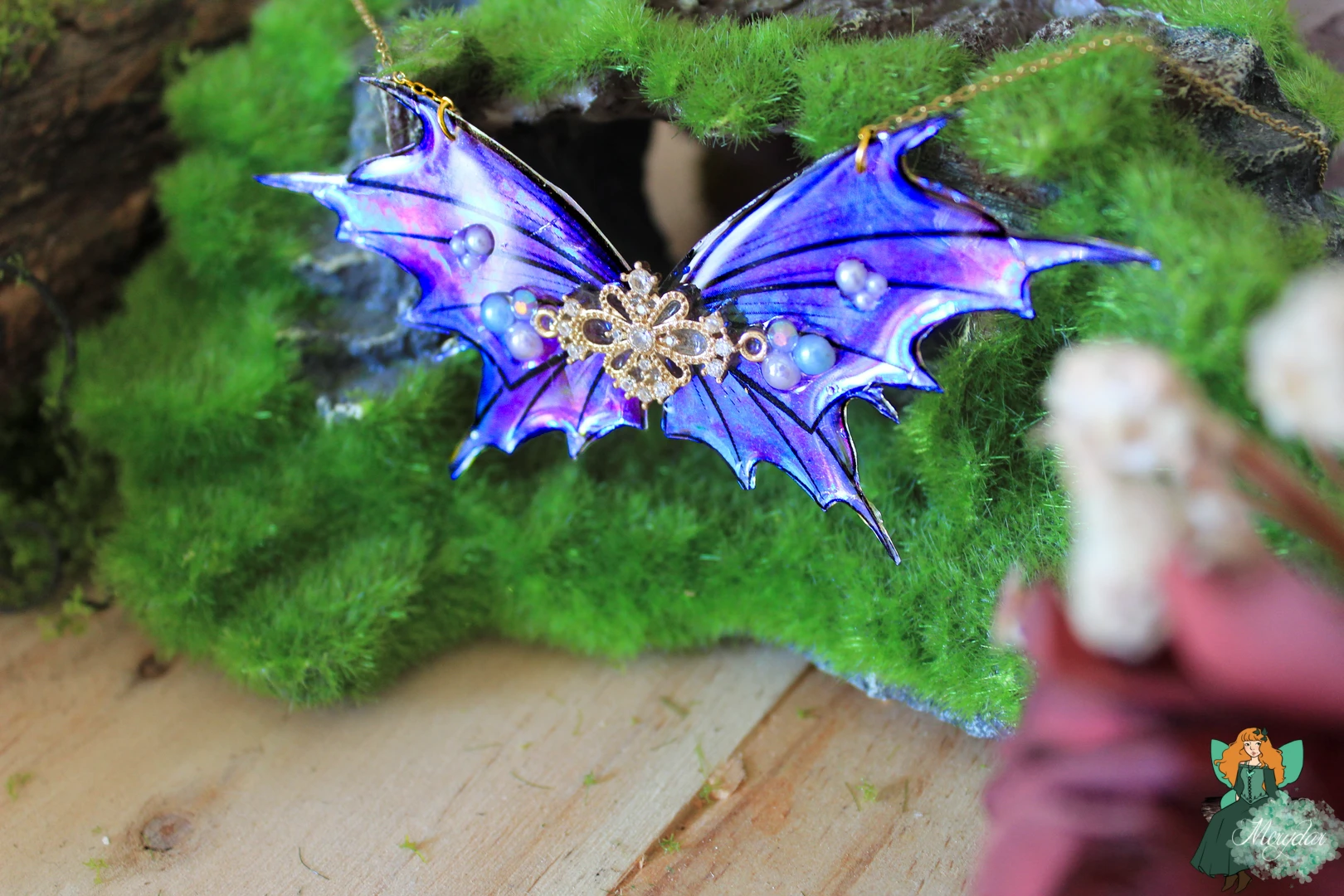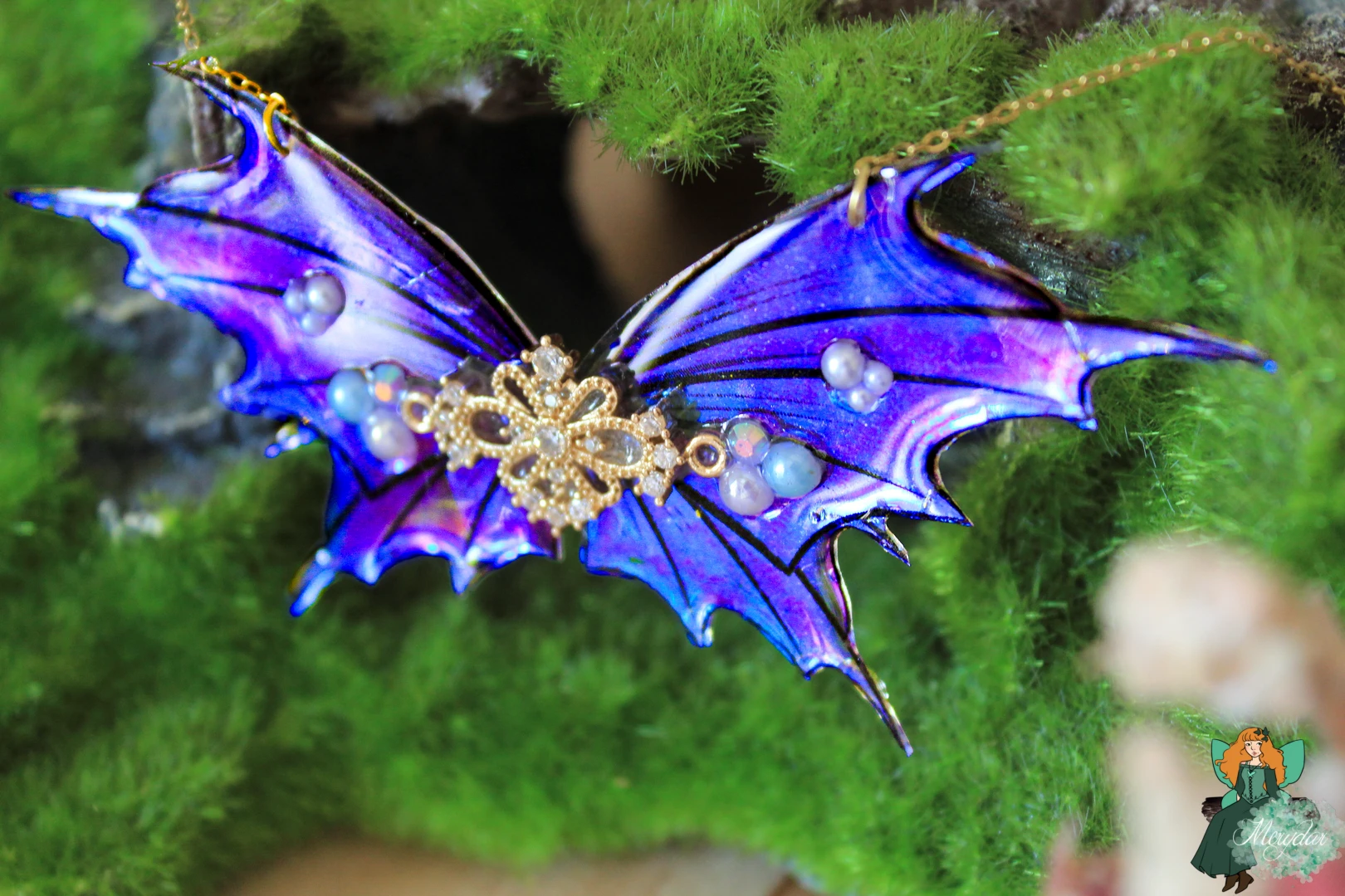 Collier composé de quatre Ailes de Fée, au dégradé de couleurs enchanteur, ornées de strass en Cristal de Fée*, avec des couleurs iridescentes qui scintillent et changent de teintes en fonction de la lumière, créant un effet magique et captivant.
