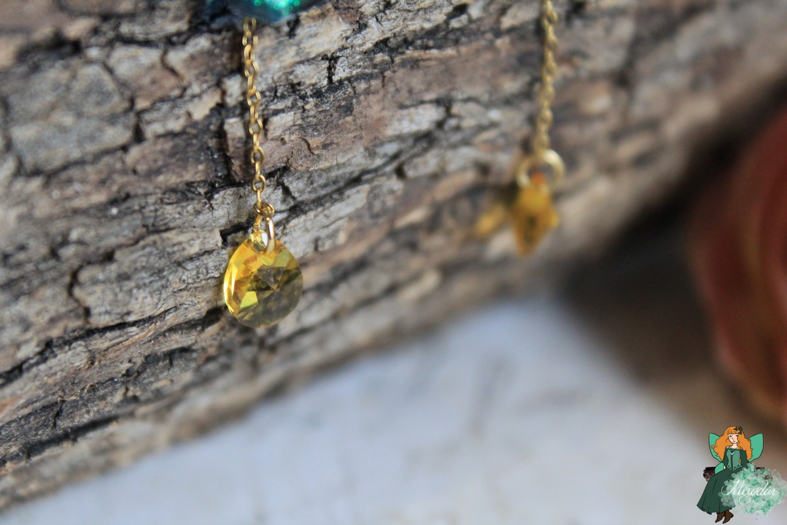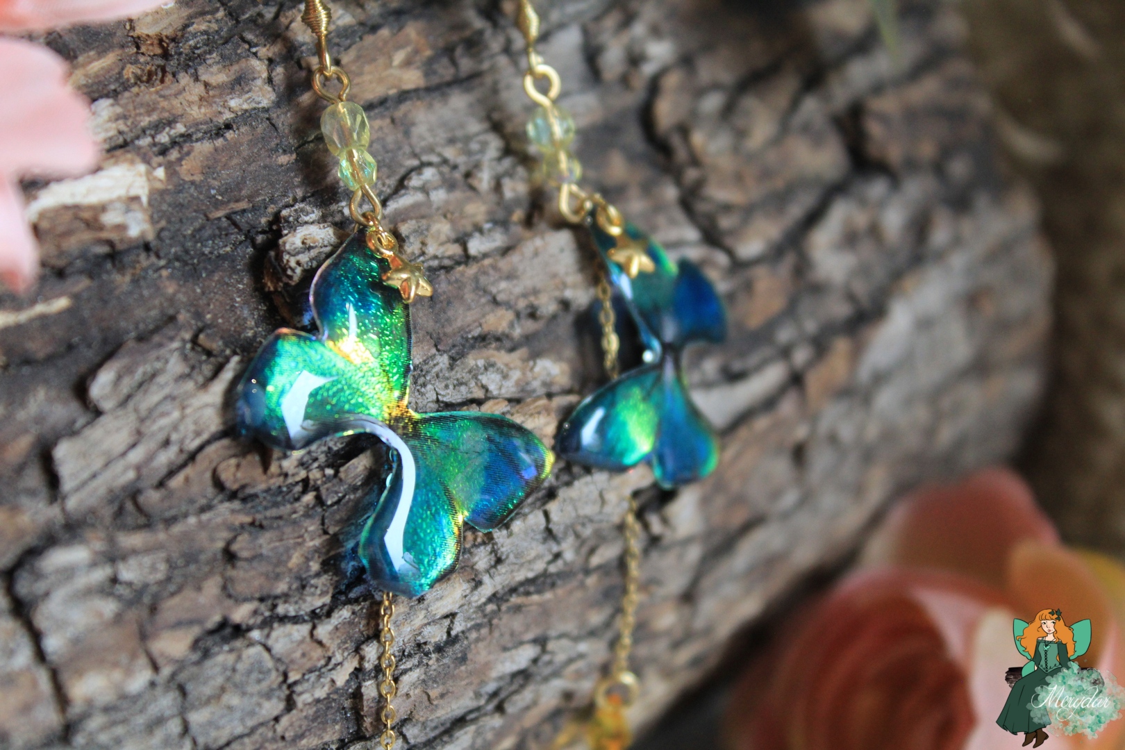 Petites douceurs Ailées. Composées de deux adorables papillons irisés, brillant de mille feux. De  Cristaux de Fée y sont suspendus. La chaine est en acier inoxydable.