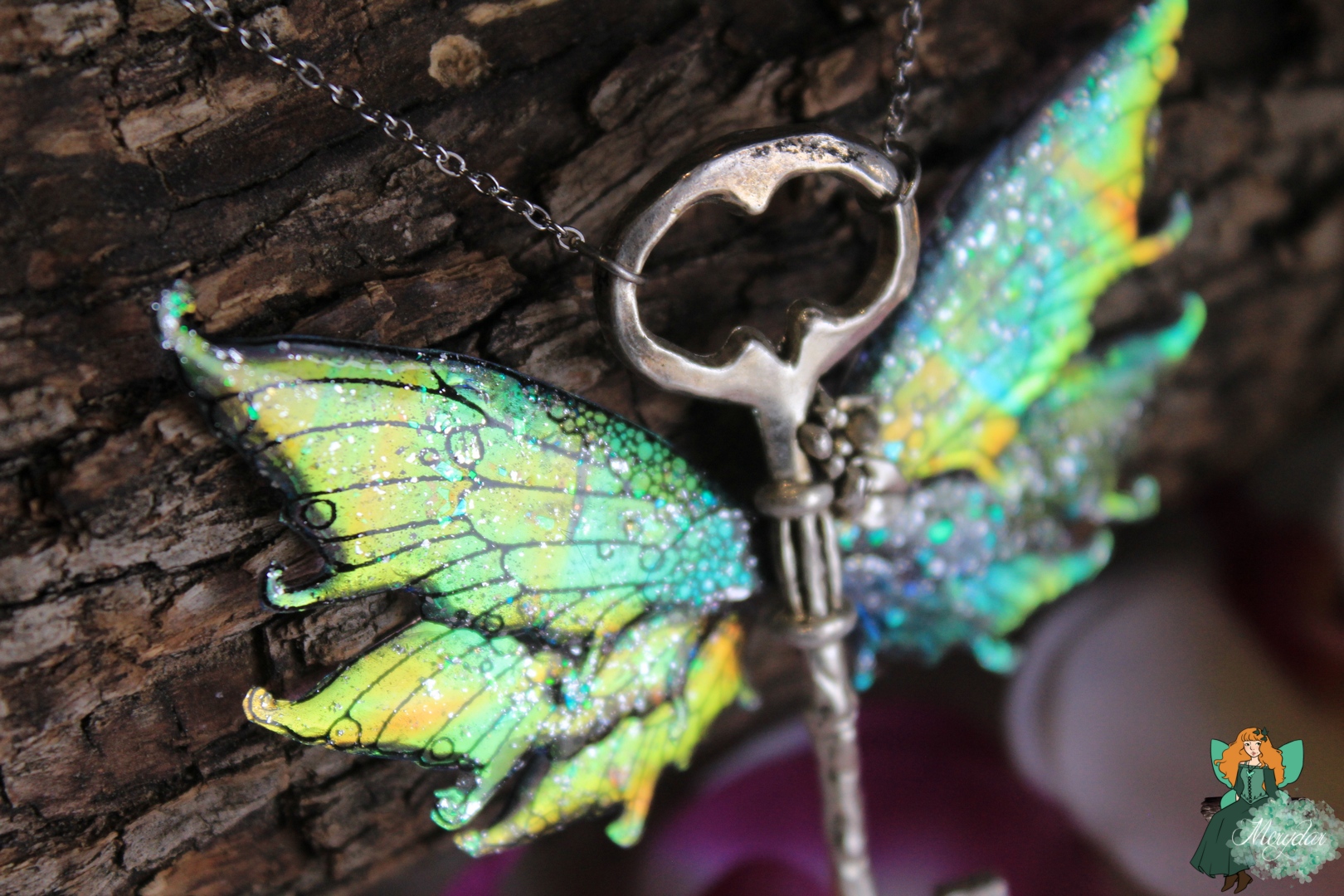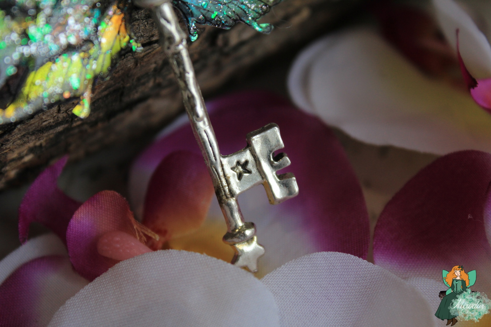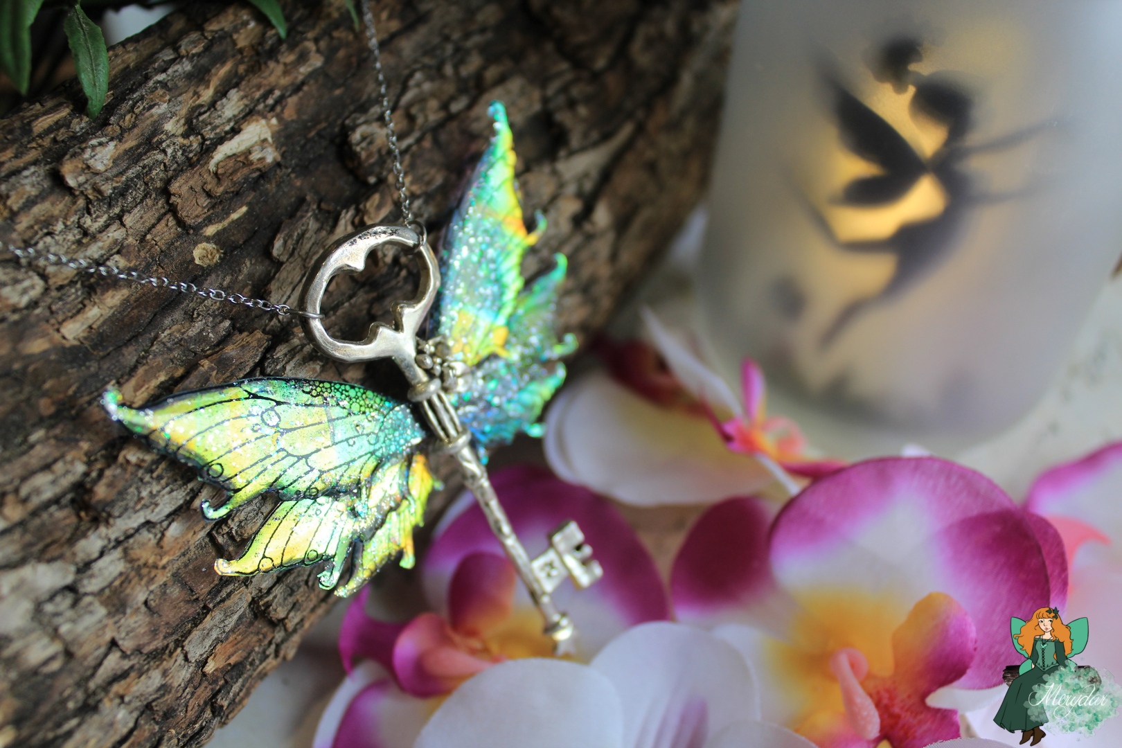Collier composé de six Ailes de Fée, au dégradé de couleurs enchanteur, ornées de strass en Cristal de Fée*. Une jolie clé orne le centre. Il se porte assez court, la chaîne mesure environ 34cm.